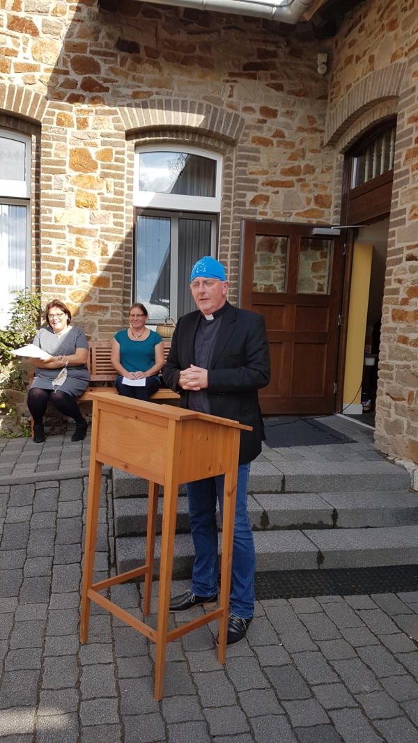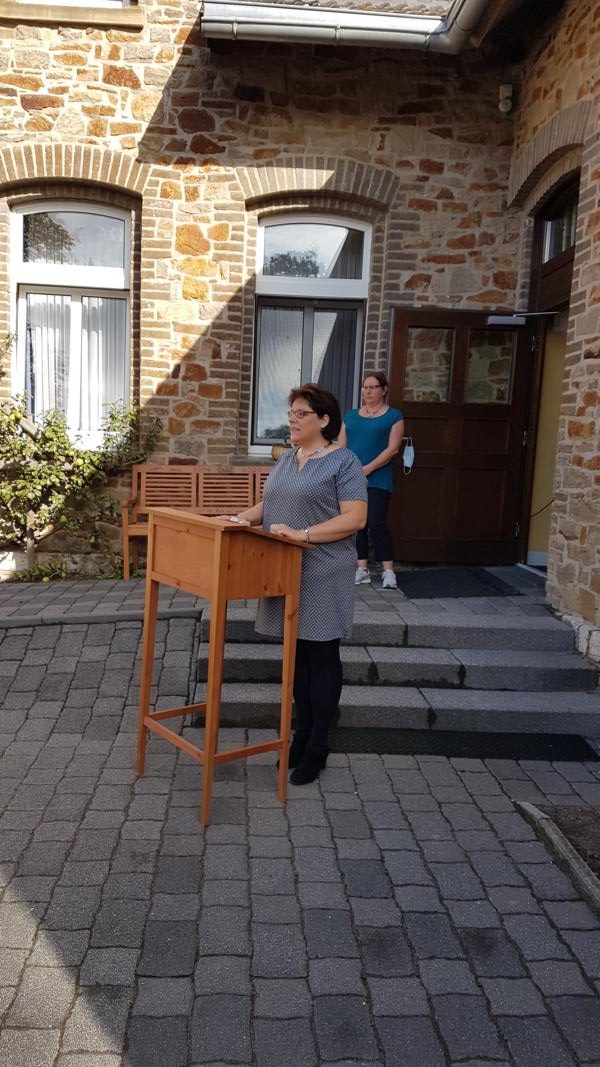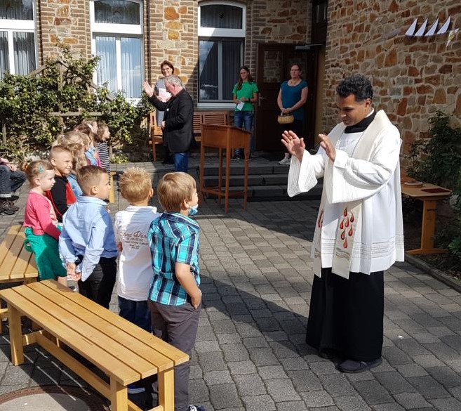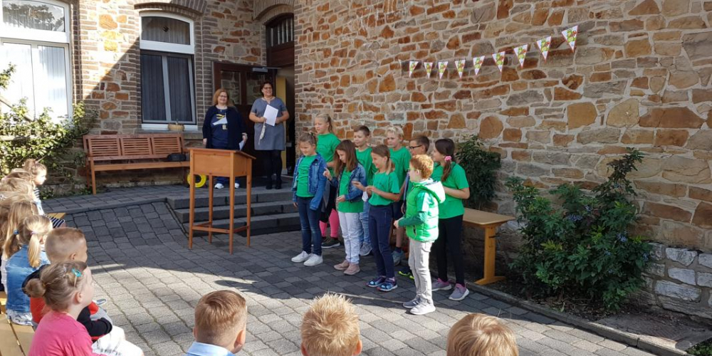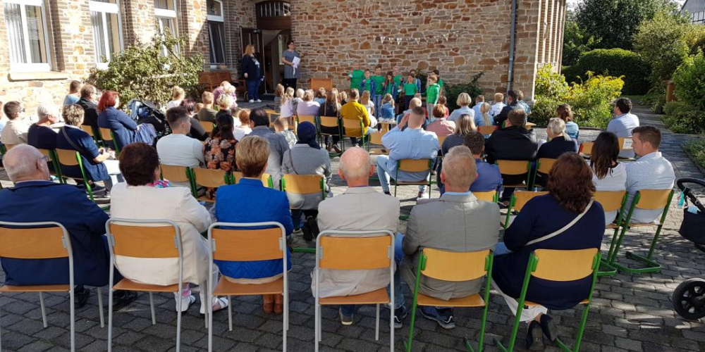 Bei schönstem Wetter fand am 29. Juli 2020 unter Coronabedingungen die Einschulung statt. Für 16 Kinder begann “der Ernst des Lebens” in besonderer Form. Schulleiterin Christiane Langener-Hölscher begrüßte alle herzlich, Schüler*Innen der Klasse 4 hatten Playbackvarianten zweier Lieder eingeübt, das Bilderbuchkino “Purzelbäume für den lieben Gott” wurde vorgelesen und die Pastöre waren zur Segnung der neuen Erstklässler gekommen. Während es dann in den Unterricht ging, versorgte der Förderverein gemeinsam mit Müttern der Klasse 2 die Anwesenden mit Getränken und abgepackten Snacks.