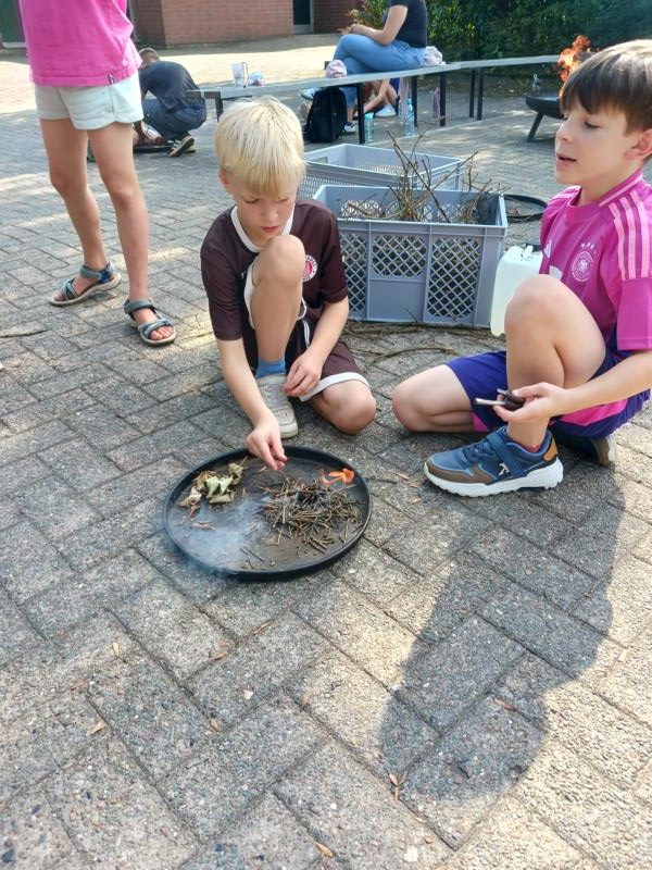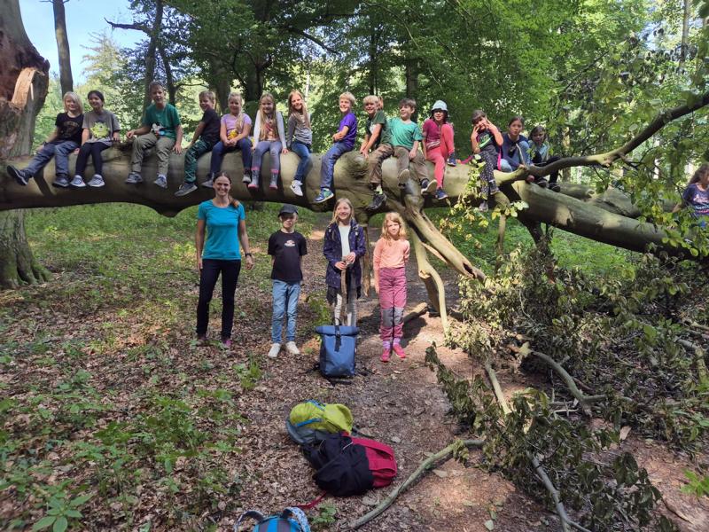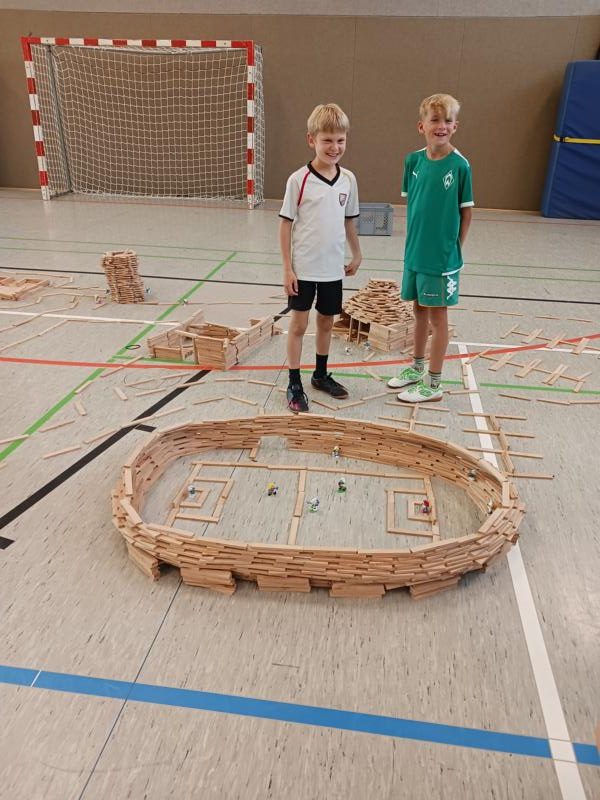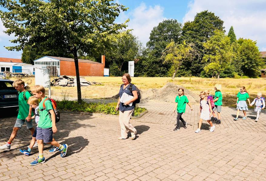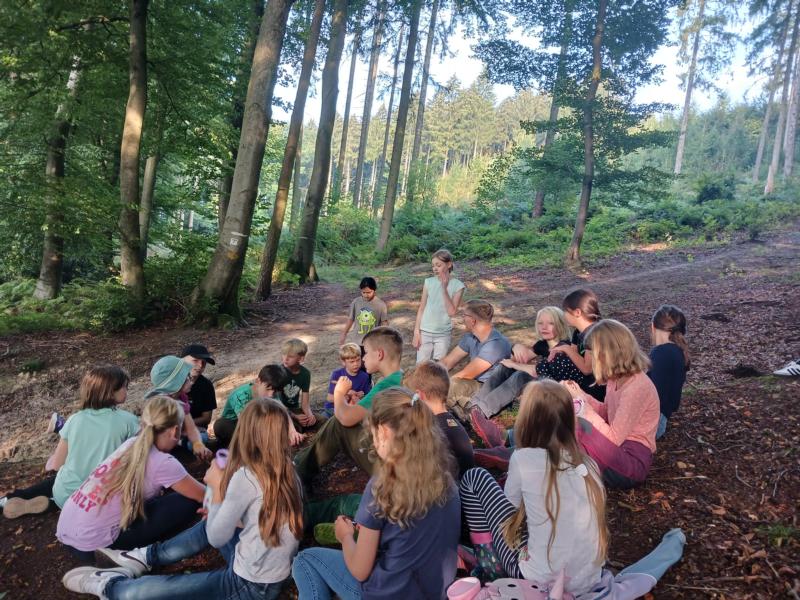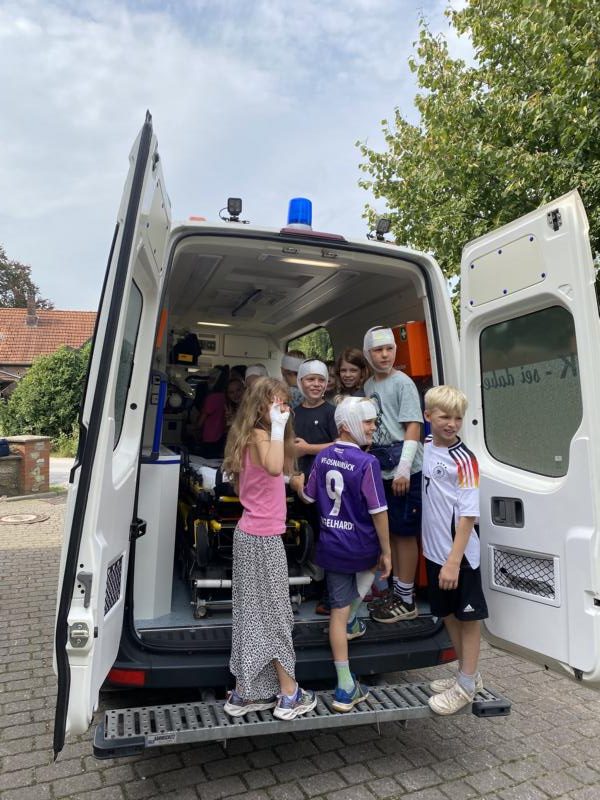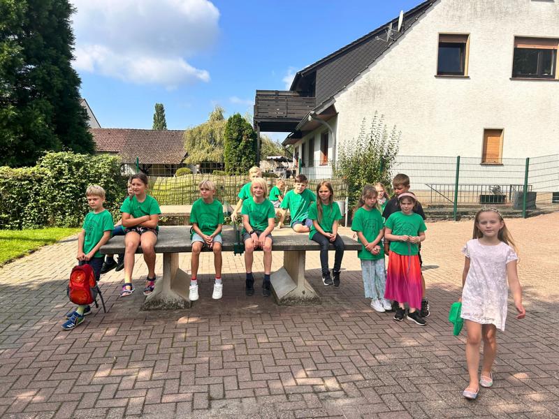 Vom 2. bis 6. September erlebte die Klasse 4 fünf spannende und abwechslungsreiche Tage zum Thema “Klassengemeinschaft stärken”. Am Montag und Dienstag kam Falko vom “Team Erleben”. Am ersten Tag haben die Kinder eine Stadt aus ca. 6000 Holzbausteine gebaut und selber Feuer gemacht. Dazu hatten sie nur Naturmaterialien und einen Feuerstrahl. Nachdem es alle geschafft haben ein kleines Feuer selber zu entzünden, wurde Stockbrot über dem großen Feuer gemacht. Am zweiten Tag ging es für die Klasse 4 in den Wald. Dort hatten sie die Gruppenaufgabe eine Murmelbahn im Wald zu bauen. Nachdem alle fertig gebauten Bahnen präsentiert wurden, absolvierte die Klasse noch kleine Kooperationsaufgaben im Wald. Am Mittwoch fuhren die Kinder mit dem Zug zum Kletterwald nach Ibbenbüren. Wir hatten den ganzen Park für uns alleine, sodass die Kinder ausgiebig klettern konnten. Am Donnerstag ging es etwas ruhiger zu. Es wurden T-Shirts gebatikt, gesnoezelt und Gesellschaftsspiele gespielt. Von Donnerstag auf Freitag stand die Lesenacht in der Schule an. Es kam sogar eine “Leseoma”, die den Kindern vorm Schlafen gehen ein Buch vorgelesen hat. Am nächsten Morgen wurde dann ganz in Ruhe gefrühstückt und alle Schlafsachen zusammengepackt. Zum Abschluss der Klassentage kam das DRK und hat mit den Kindern einen 1. Hilfe-Kurs gemacht. Wir hatten viel Spass, interessante und tolle Klassentage!