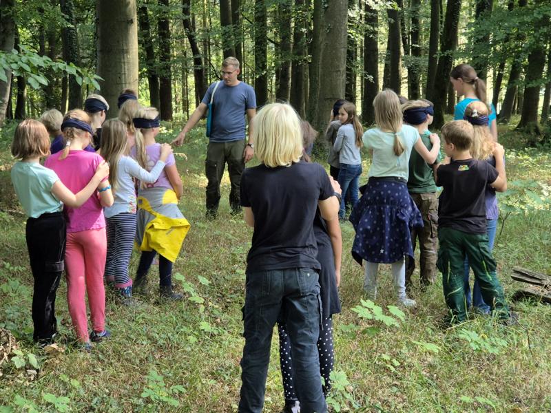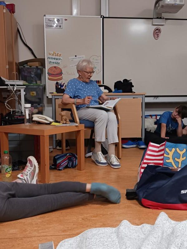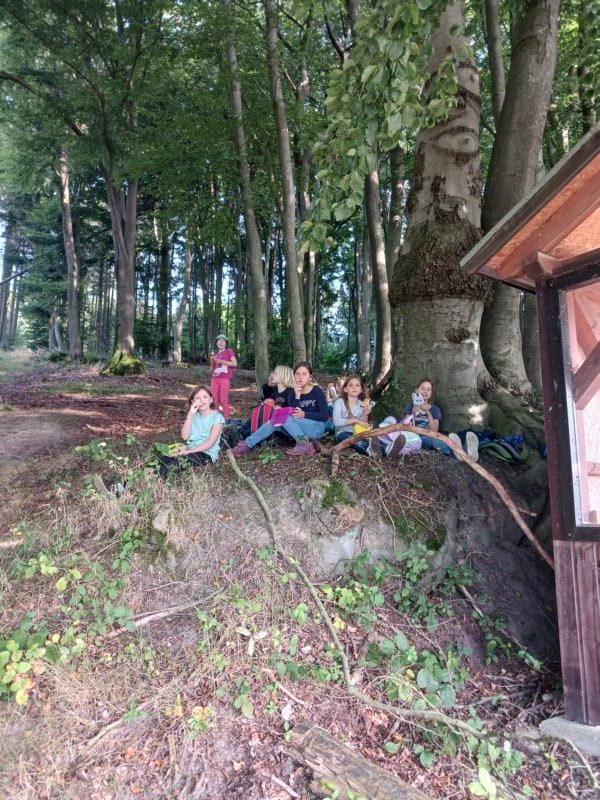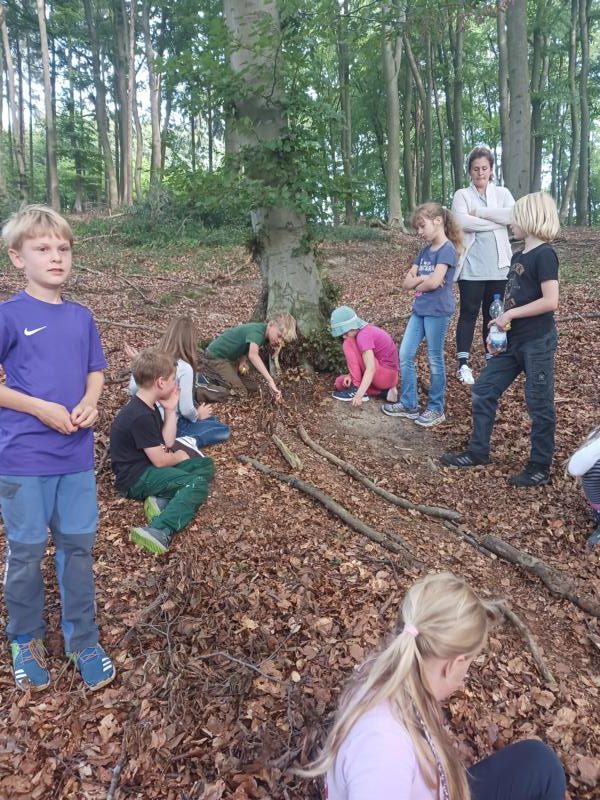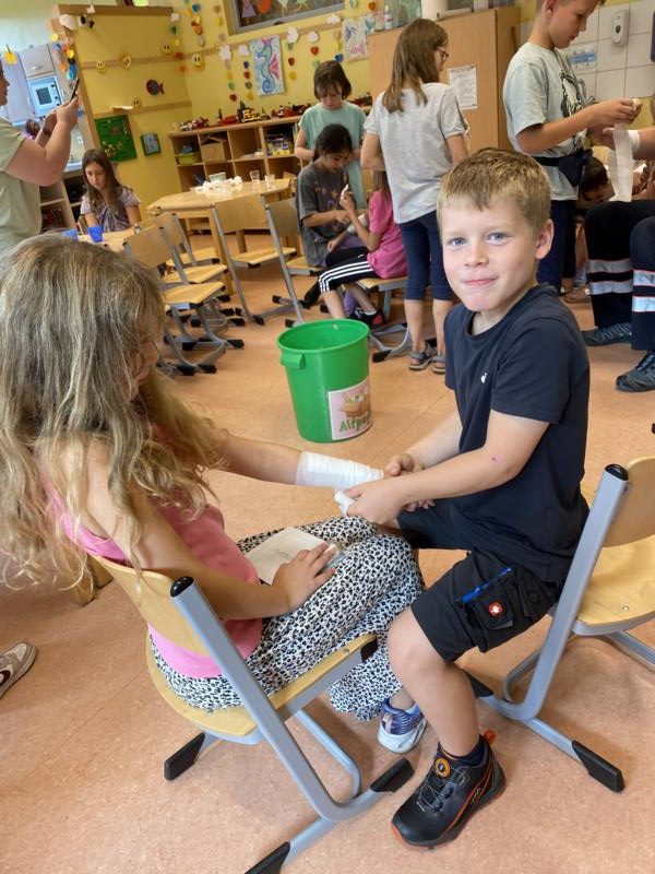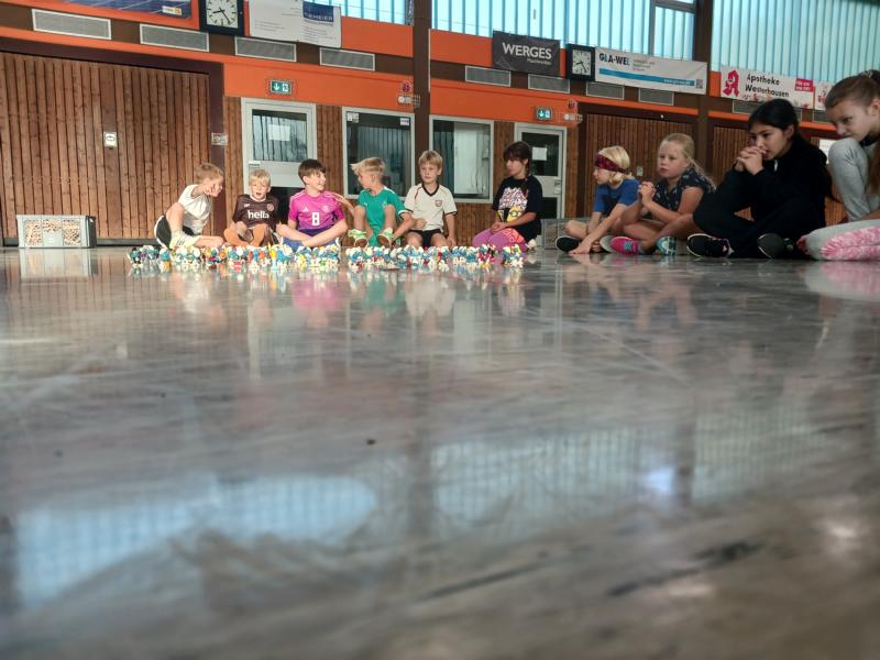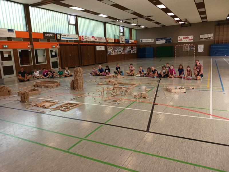 Vom 2. bis 6. September erlebte die Klasse 4 fünf spannende und abwechslungsreiche Tage zum Thema “Klassengemeinschaft stärken”. Am Montag und Dienstag kam Falko vom “Team Erleben”. Am ersten Tag haben die Kinder eine Stadt aus ca. 6000 Holzbausteine gebaut und selber Feuer gemacht. Dazu hatten sie nur Naturmaterialien und einen Feuerstrahl. Nachdem es alle geschafft haben ein kleines Feuer selber zu entzünden, wurde Stockbrot über dem großen Feuer gemacht. Am zweiten Tag ging es für die Klasse 4 in den Wald. Dort hatten sie die Gruppenaufgabe eine Murmelbahn im Wald zu bauen. Nachdem alle fertig gebauten Bahnen präsentiert wurden, absolvierte die Klasse noch kleine Kooperationsaufgaben im Wald. Am Mittwoch fuhren die Kinder mit dem Zug zum Kletterwald nach Ibbenbüren. Wir hatten den ganzen Park für uns alleine, sodass die Kinder ausgiebig klettern konnten. Am Donnerstag ging es etwas ruhiger zu. Es wurden T-Shirts gebatikt, gesnoezelt und Gesellschaftsspiele gespielt. Von Donnerstag auf Freitag stand die Lesenacht in der Schule an. Es kam sogar eine “Leseoma”, die den Kindern vorm Schlafen gehen ein Buch vorgelesen hat. Am nächsten Morgen wurde dann ganz in Ruhe gefrühstückt und alle Schlafsachen zusammengepackt. Zum Abschluss der Klassentage kam das DRK und hat mit den Kindern einen 1. Hilfe-Kurs gemacht. Wir hatten viel Spass, interessante und tolle Klassentage!