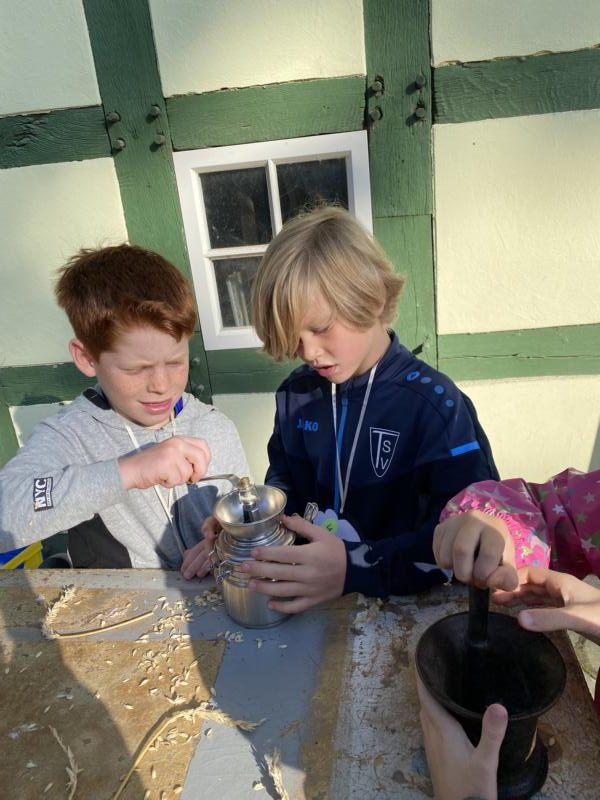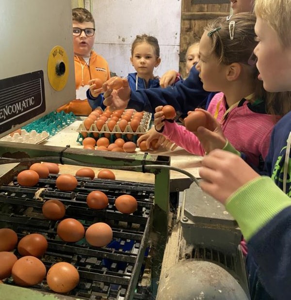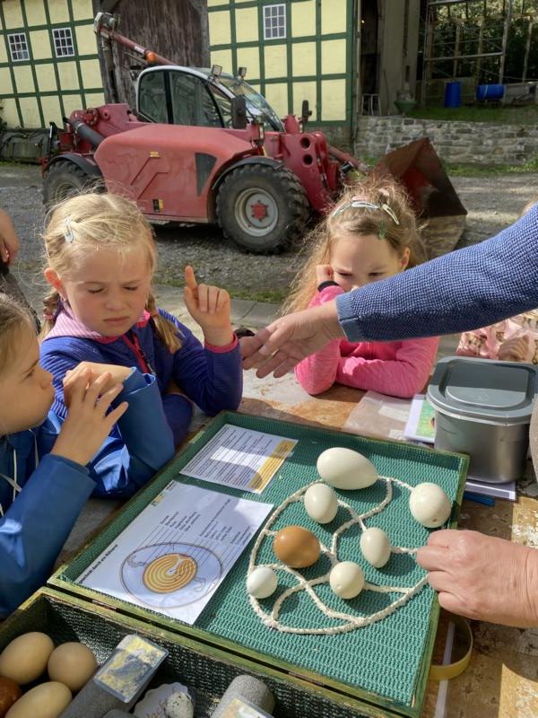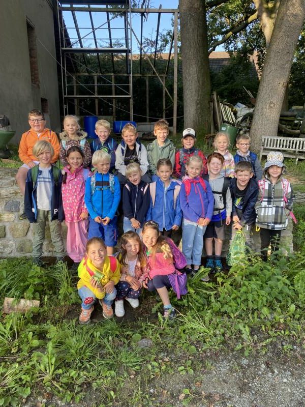 Am 21. August 2024 besuchte die Klasse 2 den Hof Sixtus, um dort an dem Projekttag “Huhn und Ei” teilzunehmen. Mit großer Begeisterung erkundeten die Kinder den Hof und lernten viel über die dort lebenden Hühner, das Legen und Sortieren der Eier uvm. Besonders gut kamen die verschiedenen Eierexperimente und das Mahlen der unterschiedlichen Getreidesorten bei den Kindern an.