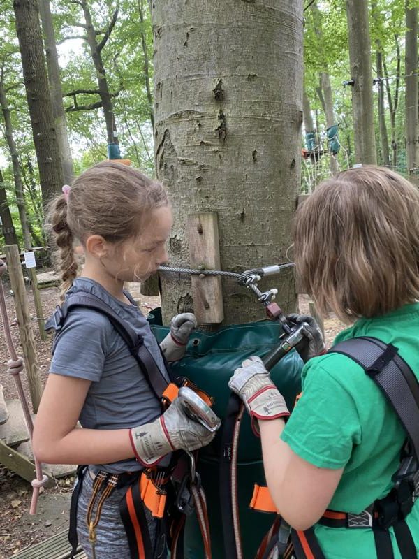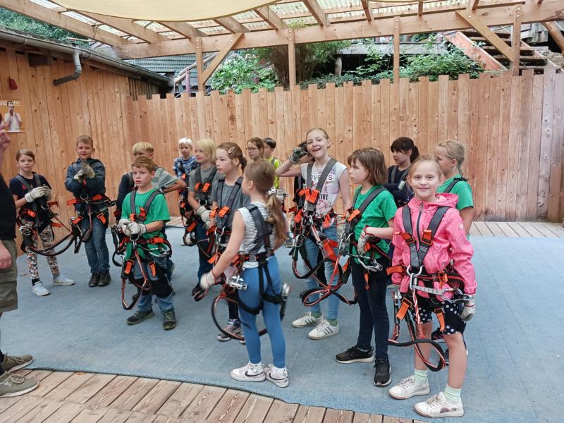 In diesem Jahr haben wir uns als Schule entschlossen die Projekttage “Ich-Du-Wir” durchzuführen, um die Gemeinschaft in den Klassen und in der Schule weiter zu stärken. Dazu gab es in der Schule an zwei Tagen verschiedene Angebote, die die Kinder klassenweise durchlaufen haben. Unter anderem gab es Kooperationsspiele in der Turnhalle, eine Gruppenschnitzeljagd zum Thema Harry Potter und das “Fliegende Ei”, wo die Kinder ein rohes Ei gemeinsam so einpacken mussten, dass es einen Sturz aus einer gewissen Höhe heile überstehen sollte. Außerdem gestalteten die Kinder gemeinsam als Klasse ein WIR-Plakat. Als Highlight fuhren wir in den Kletterwald nach Bad Iburg. Nachdem wir mit dem Bus angekommen waren, bekamen alle Kinder im Kletterwald einen Sicherheitsgurt und eine Einweisung, bevor sie die verschiedenen Kletterelemente bewältigen durften. Ein tolles Erlebnis. Man sah, wie die Kinder sich gegenseitig unterstützten, sich Tipps gaben und sich motivierten, damit alle die verschiedenen Parcours schafften. Eine tolle Bereicherung für die ganze Schule.