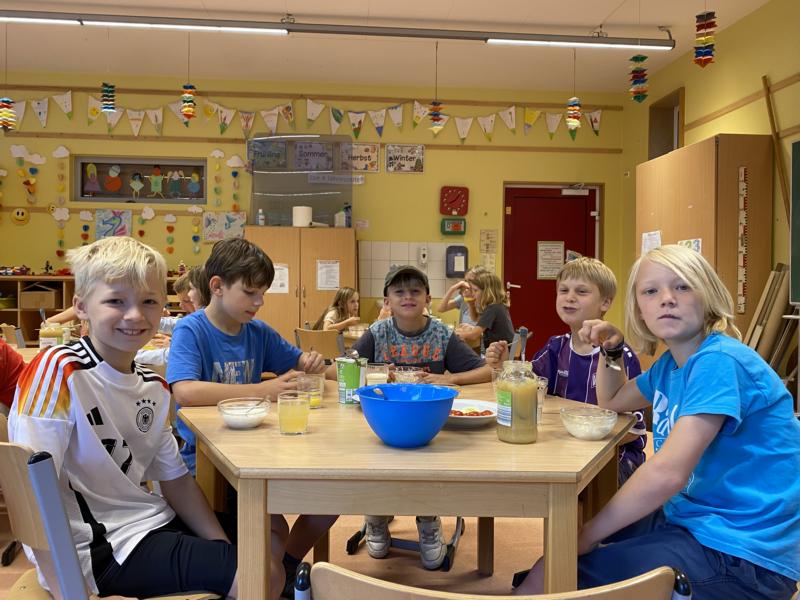Während die Erstklässler ihre Rollerführerscheinprüfung ablegten, bereiteten die anderen Schülerinnen und Schüler ein leckerer Frühstück für die ganze Schule vor. Es wurden Obstspieße gesteckt, Quark gerührt, Gemüsestickt geschnitten und selbstgebackene Brote liebevoll geschmiert.