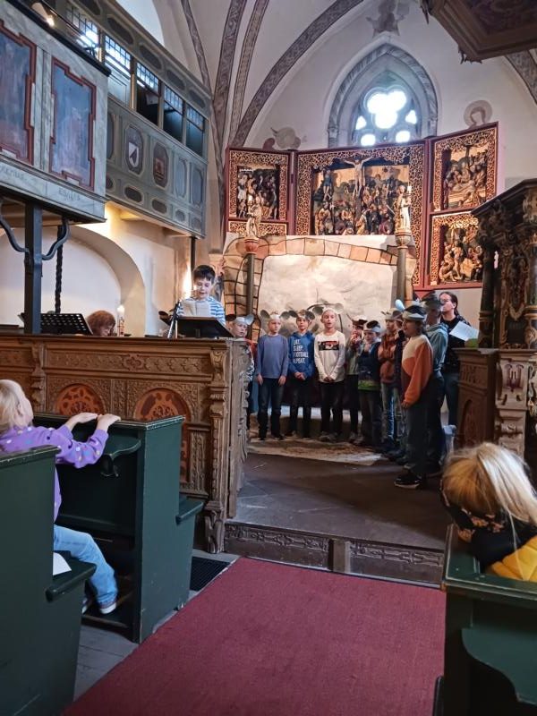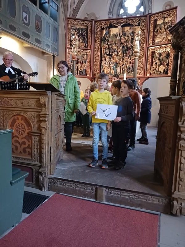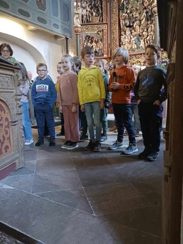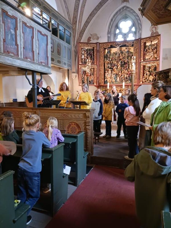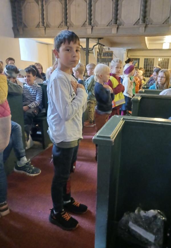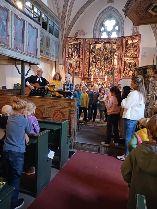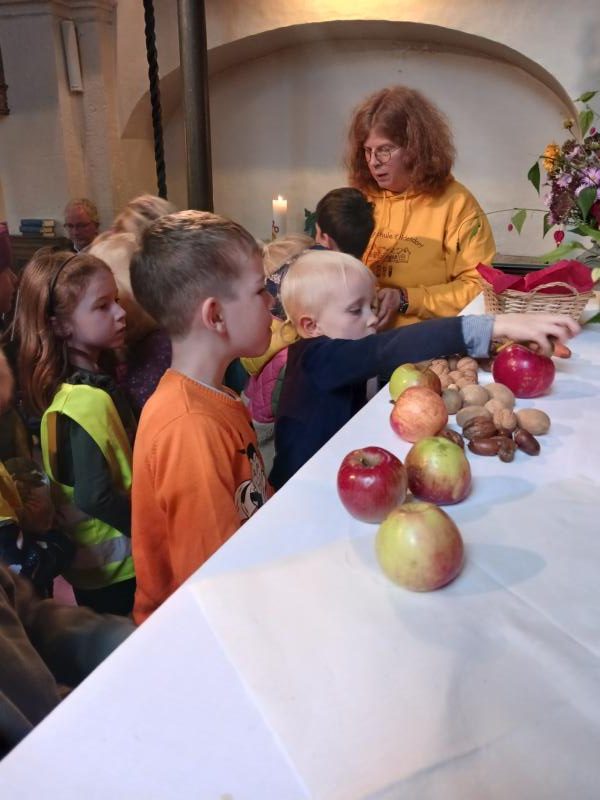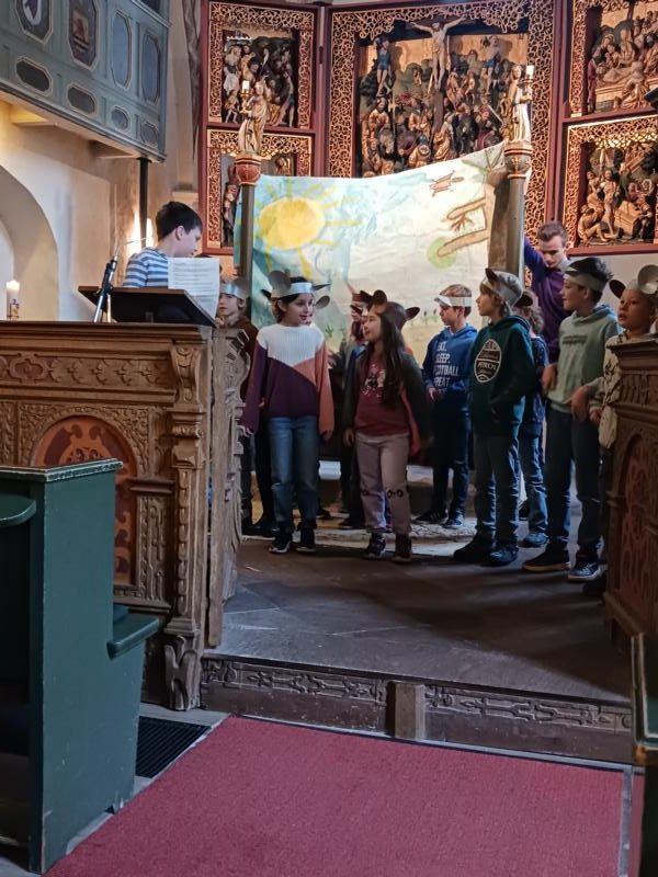 Heute feierten wir mit den Kindern, Lehrkräften und Familien der Grundschule Oldendorf den Erntedankgottesdienst in der Kirche in Oldendorf. In den Wochen zuvor hatten die einzelnen Klassen verschiedene Programmpunkte vorbereitet, sodass wir einen sehr schönen und abwechslungsreichen Gottesdienst hatten. U.a. las Klasse 4 selbstgeschriebene Fürbitten vor, Klasse 3 präsentierte ein Theaterstück mit selbst gemalten Bühnenbildern, Klasse 2 untermalte einige Lieder mit Bildern und Klasse 1 begleitete den Segen mit dazu passenden Bewegungen. Außerdem legten die Kinder Gaben auf den Altar, sodass er am Ende reichlich und bunt geschmückt war.