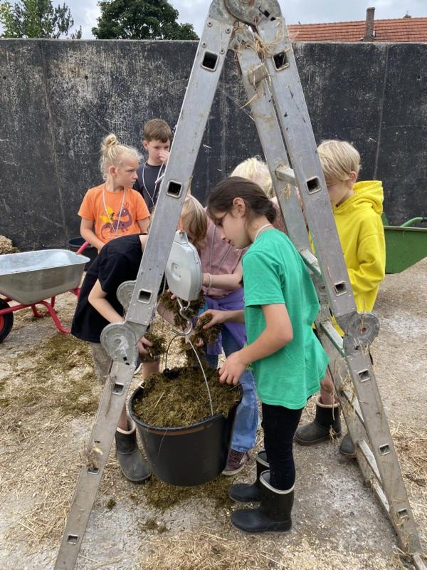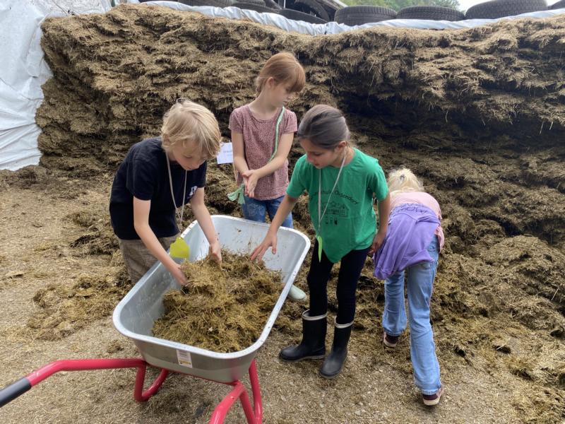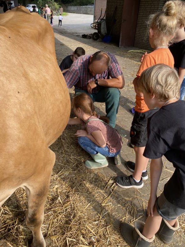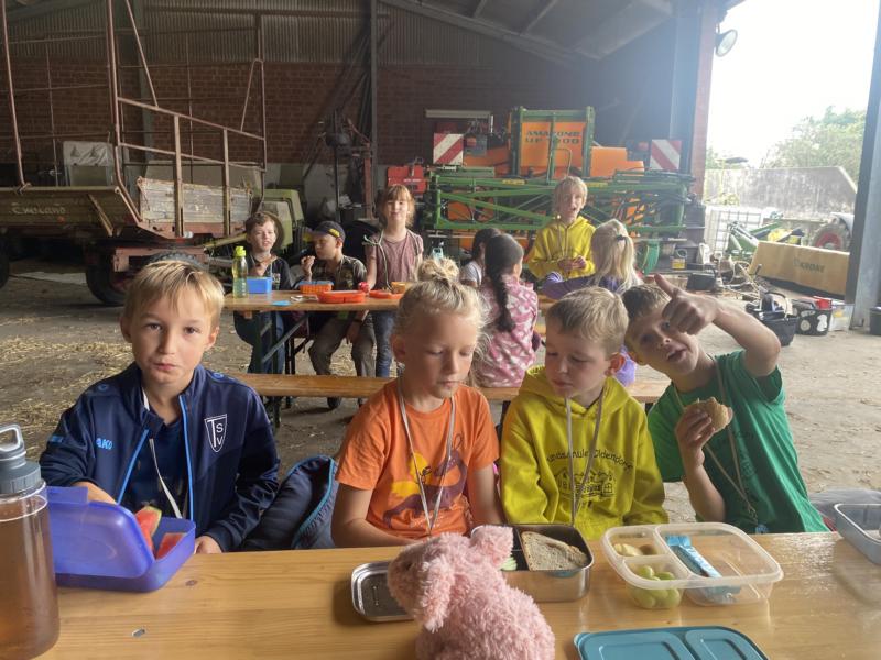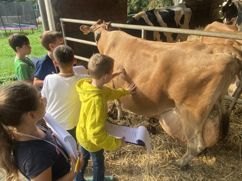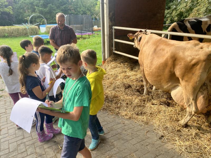 Nachdem die Kinder am Vortag einiges über die Landwirtschaft, dort besonders über die Herstellung von Milch erfahren haben, besuchte unsere Klasse 3 den Betrieb Bösemeyer in Westerhausen. Dort konnten sie dann hautnah bei den Kühen und Kälbchen sein und ihr erworbenes Wissen vertiefen. An vier Stationen durften die Kinder landwirtschaftlichen Maschinen ansehen, eine Kuh “untersuchen” und selber melken. Das war gar nicht so einfach, aber alle Kinder haben es geschafft. Außerdem durften sie die Tagesration Kuhfutter mischen und vieles über die Merkmale einer Kuh und die Kuhhaltung erfahren. Am Ende des interessanten Vormittags waren sich alle einig: „Das war eine erlebnisreichen Tag.“ Herzlichen Dank an die Landfrauen und den Betrieb Bösemeyer für dieses tolle Projekt.