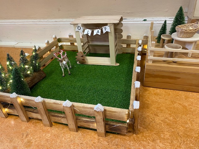 Heute bestaunten die Kinder das große Gehege und den Stall von Olaf. Dort kann er sich wirklich wohlfühlen. Außerdem hatte Tomte den Kindern Haferflocken in einem Korb hingestellt, damit sie Olaf auch füttern können, wenn der Futtertrog leer ist. Pflichtbewusst werden die Kinder sich um das Rentier kümmern.