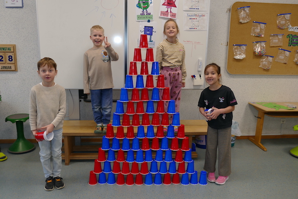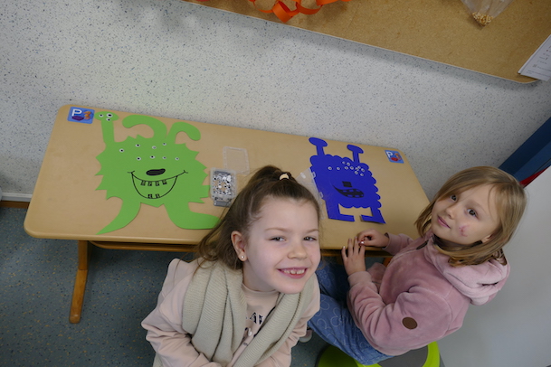 Danach wurde an Stationen zum Thema 100 gearbeitet. Die Kinder konnten 100 Fingerabdrücke stempeln, ein 100er Puzzle lösen, etwas mit 100 Bauklötzen bauen, 100 bunte Punkte auf ein Blatt drucken, eine Girlande aus 100 Papierstreifen basteln, 100 Wackelaugen auf ein Monster kleben, eine 100 Tage Schulkind-Krone basteln, einen Turm aus 100 Bechern bauen, bis 100 Würfeln, alle Zahlen bis 100 aufschreiben, eine 100er Brille basteln oder 100 Buchstaben stempeln. Natürlich wäre es keine richtige Feier ohne einen Kuchen, also gab es zum Abschluss noch einen Hunderterkuchen. Abschließend lässt sich sagen: Es war ein sehr schöner Vormittag!