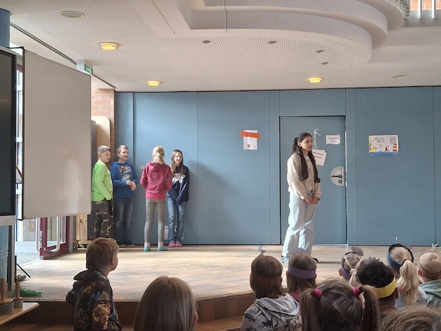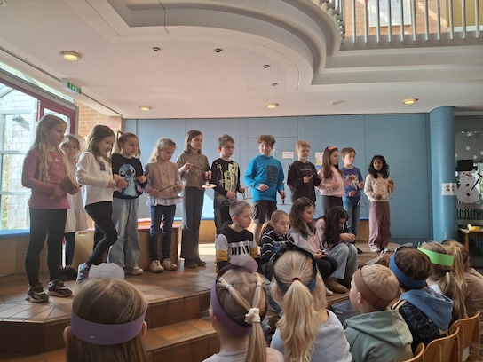 Die zweiten Klassen präsentierten selbstgeschriebene Bildergeschichten und zeigten zudem einen Mitspielsatz zum „Schwan“ aus dem „Karneval der Tiere“ mit Instrumenten. Der vierte Jahrgang begeisterte mit einem selbst entwickelten Theaterstück rund um die Ostereiersuche. Den Abschluss bildete eine dritte Klasse mit spannenden Buchvorstellungen.