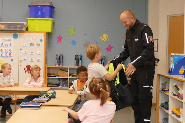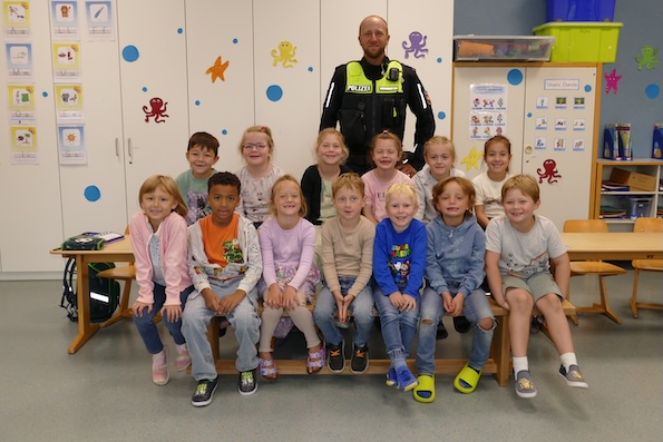 Am Donnerstag, den 04.09.2025, staunten die Erstklässler nicht schlecht, als plötzlich ein echter Polizist aus Belm in Uniform bei ihnen im Klassenzimmer stand. Zuerst waren alle Kinder etwas schüchtern. Dies gab sich aber im Verlauf der Schulstunde. Der Polizist war gekommen, um sich und seine Arbeit vorzustellen und den Kindern die Angst im Umgang mit der Polizei zu nehmen. Gemeinsam mit den Kindern wurde besprochen, wann und wie man die Polizei rufen kann, und um welche Notfälle sie sich kümmert. Anschließend bestaunten die Kinder die Ausrüstung des Polizisten und durften selber feststellen, wie schwer eine Schutzweste ist.