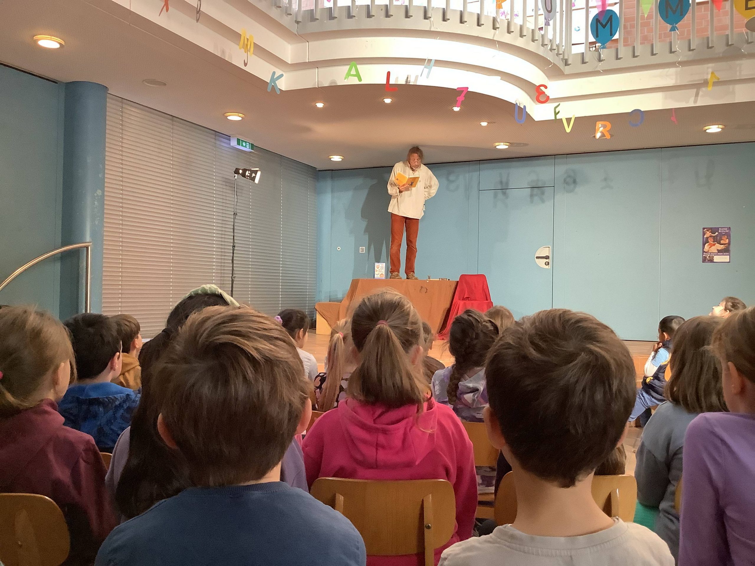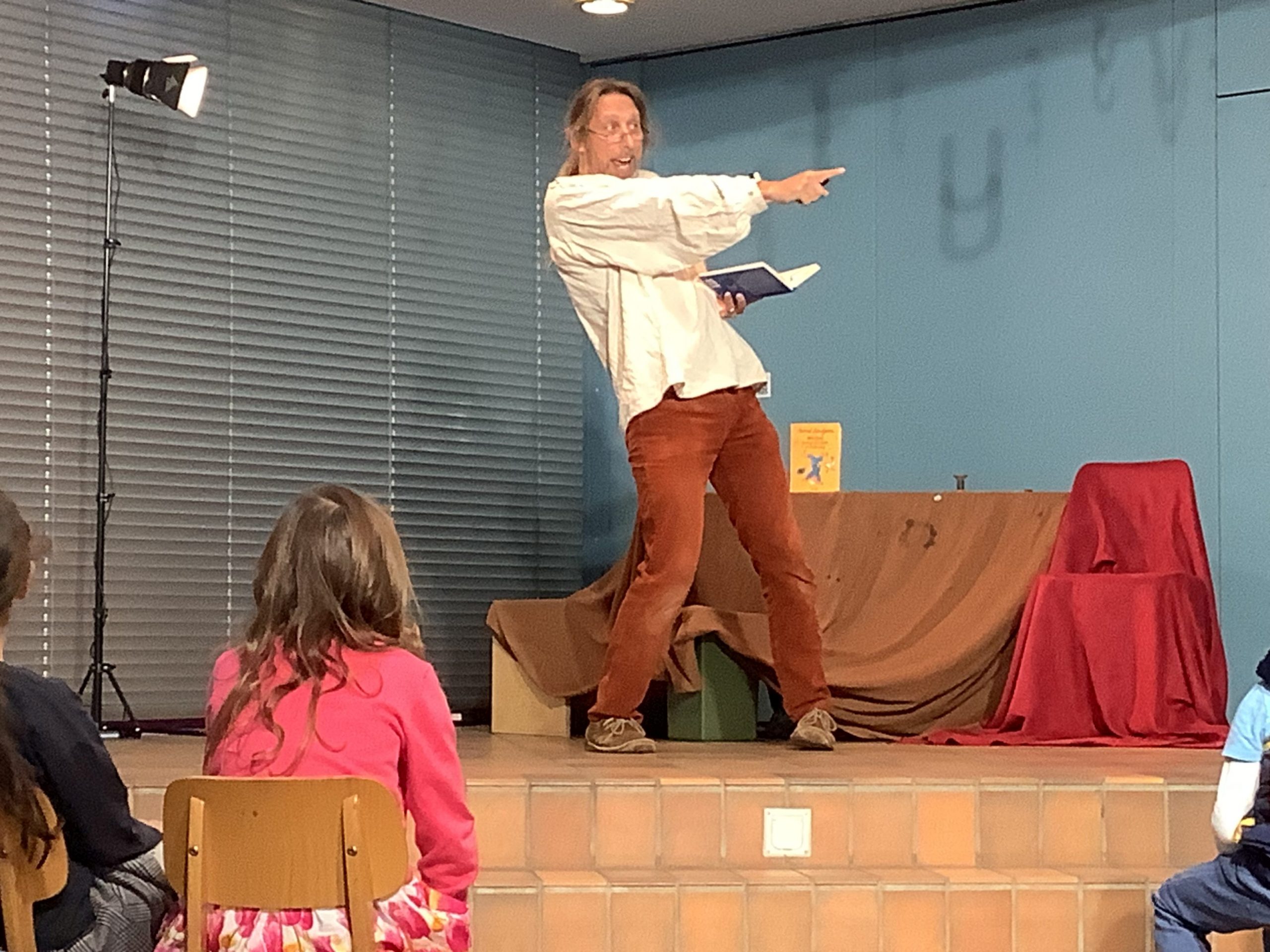 Am 5.10.23 war jemand ganz Besonderes an unserer Schule. Er heißt Rainer Rudloff. Er ist Schauspieler und Vorleser. Für Klasse 1 und 2 hat er zum Thema „Frech muss man sein“ eine Geschichte von Michel und etwas vom Sams vorgelesen. Dabei las er nicht nur, sondern er spielte die Figuren auch. Dann kamen die 3. und 4. Klassen dran und wir durften uns zwischen 4 Büchern entscheiden. Aber das Spannende war, wir konnten die Bücher nicht sehen. Two4U hieß das Programm. Herr Rudloff hat aus 4 Büchern kurze Sätze vorgelesen und dann wurde abgestimmt. Gewonnen haben die Bücher Kannawoniwasein und Bauer Giles von Ham. Die waren echt spannend und lustig. Wir haben uns sehr gefreut, dass Rainer Rudloff da war. Es war sehr schön.