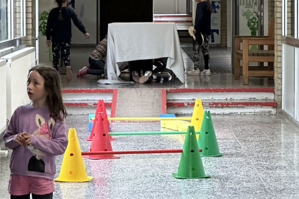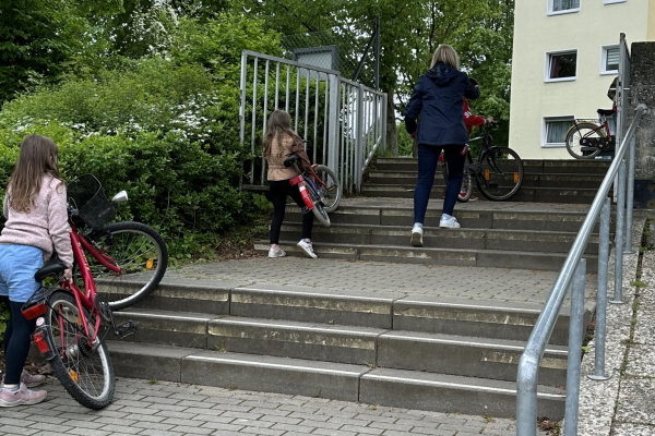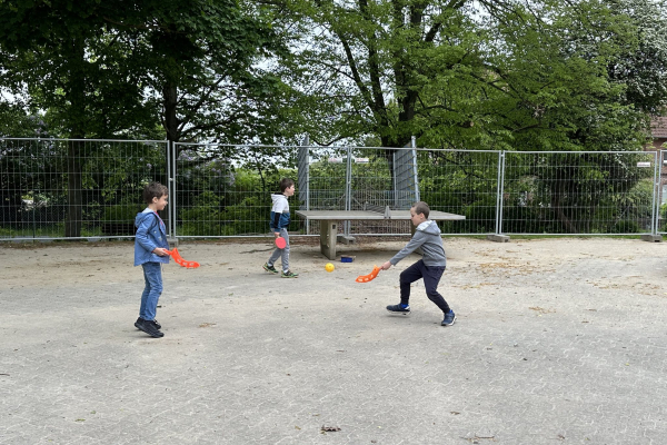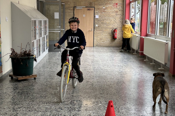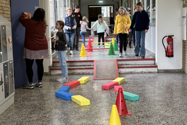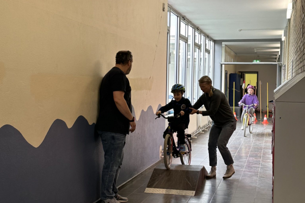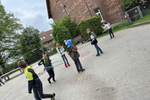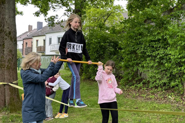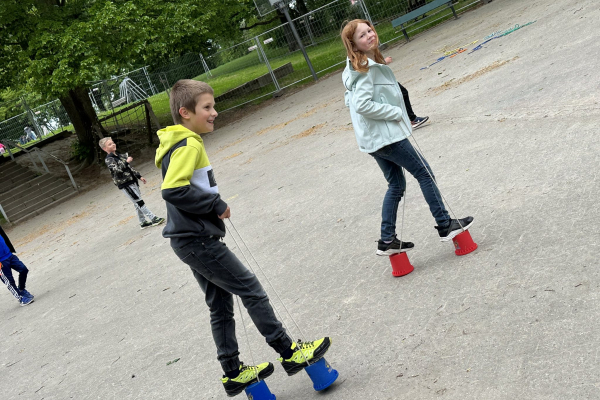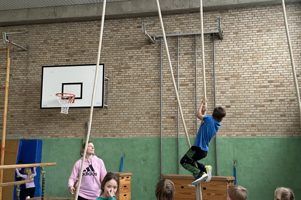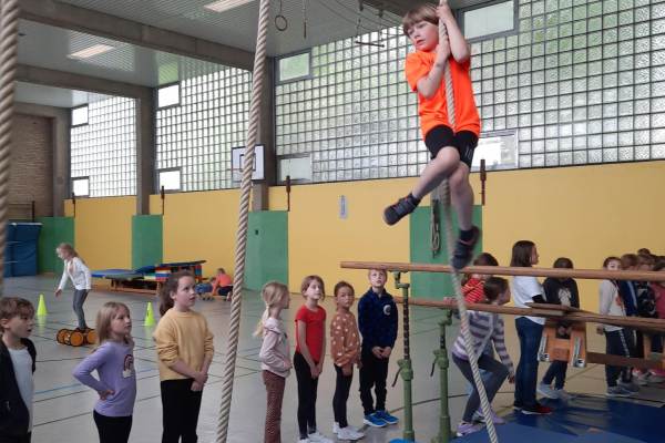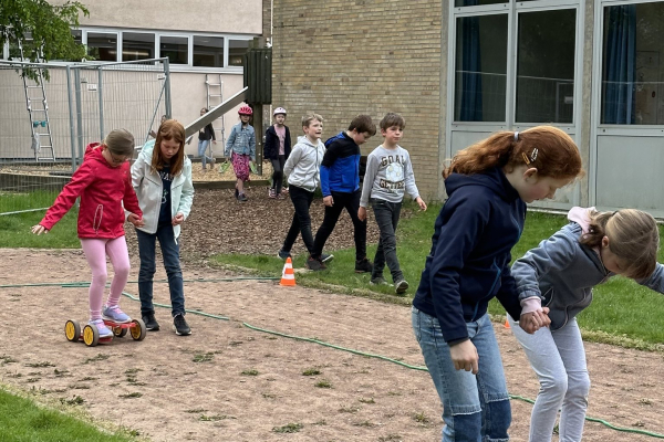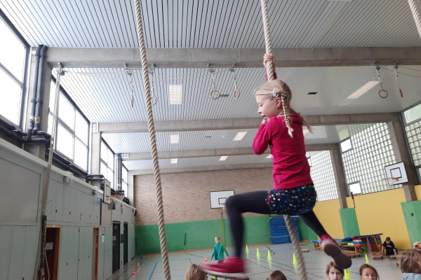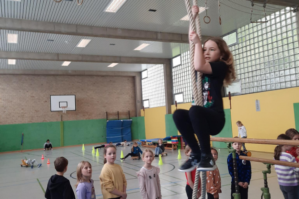 Am Dienstag, 15.5. haben wir einen Mobilitätstag in der Schule gehabt. Es gab viele Stationen von unseren Lehrerinnen. In der Sporthalle gab es eine Kletterstation und einen Rollbrettparcours. Auf dem Flur konnten wir über Rampen mit dem Fahrrad fahren. Draußen balancierten wir über ein Seil, die Slackline. Mir hat das Klettern an den Seilen am meisten Spaß gemacht. (Lilli)