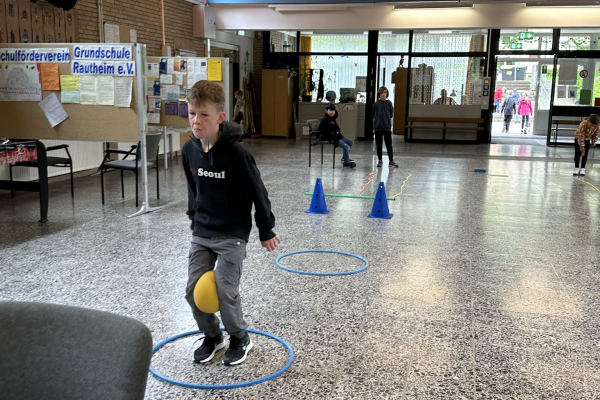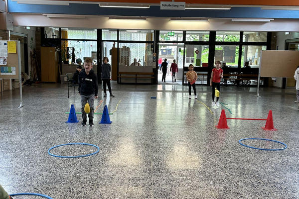 Wir hatten am 16.5. einen Mobi-Tag. Charlie, Jaron, Zimu und ich waren am meisten in der Sporthalle. Dort hat Frau Jarzombek einen Kletterparcours aufgebaut und wir durften mit Rollbrettern herumfahren. Bei Frau Kammerhoff mussten wir auf einem Band balancieren. In der Aula war ein Parcours, wo wir etwas zwischen die Beine geklemmt haben und ihn so hüpfen mussten. (Felix, Chalie, Jaron, Zimu)
