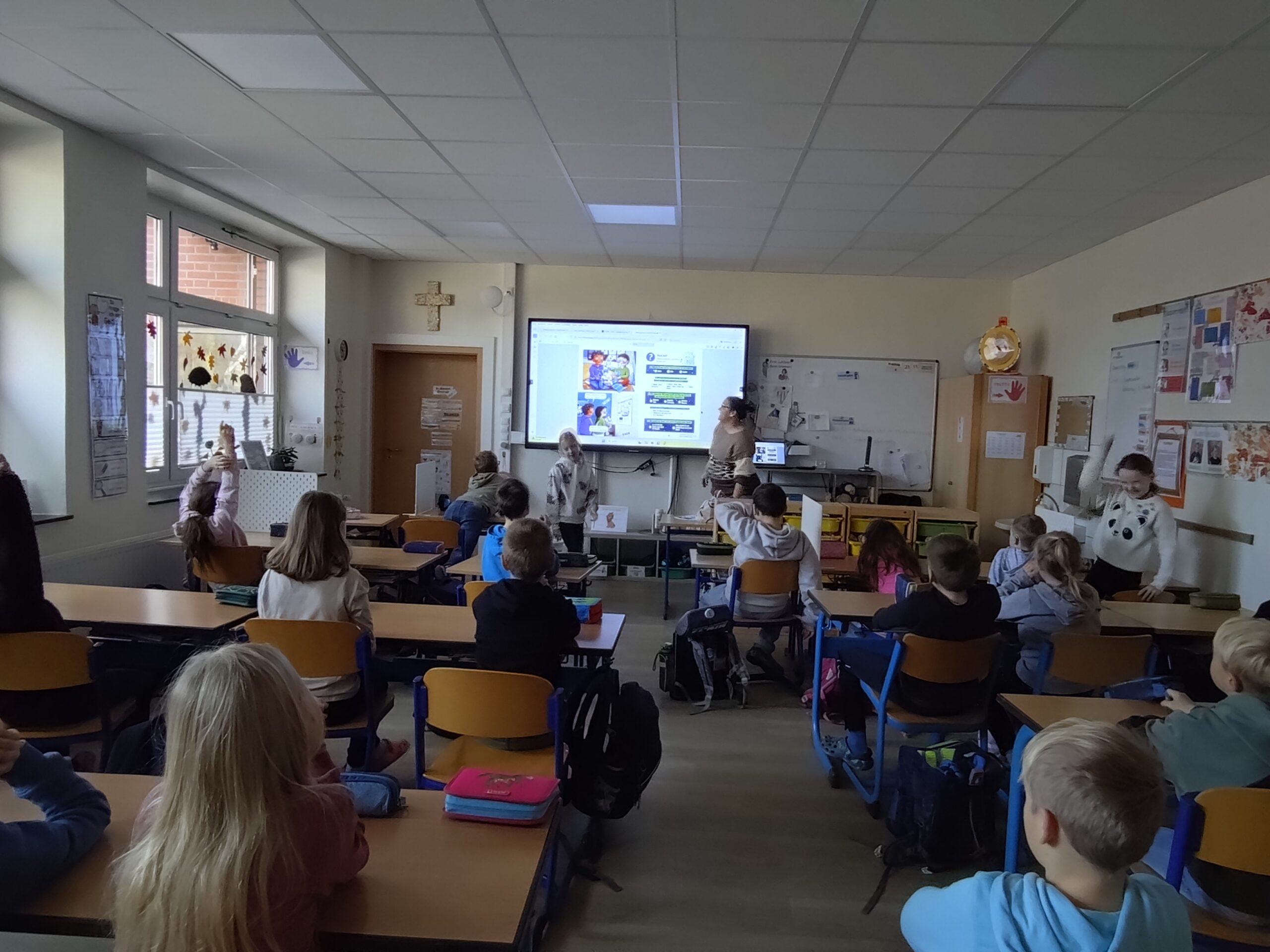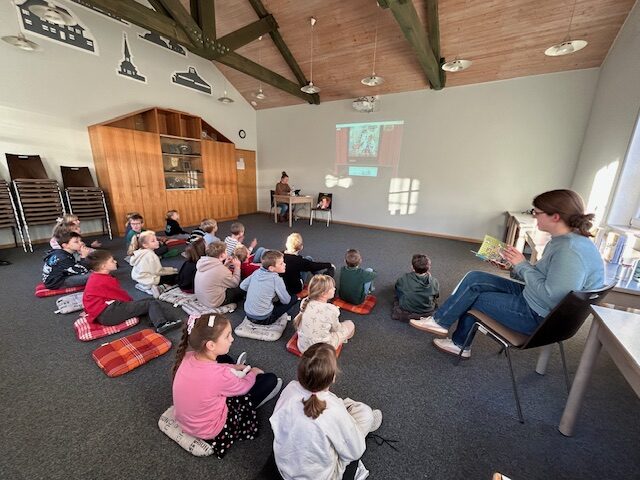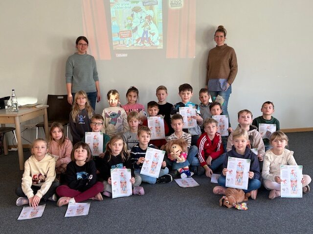 Die Klassen 1 und 2 hörten im Gemeindezentrum gemeinsam mit dem Bücherei- Maskottchen Ilselotte Keksberg aus Meppen das Buch „Der grüne Glibberbrief“ aus der Reihe „Die Schule der magischen Tiere“.