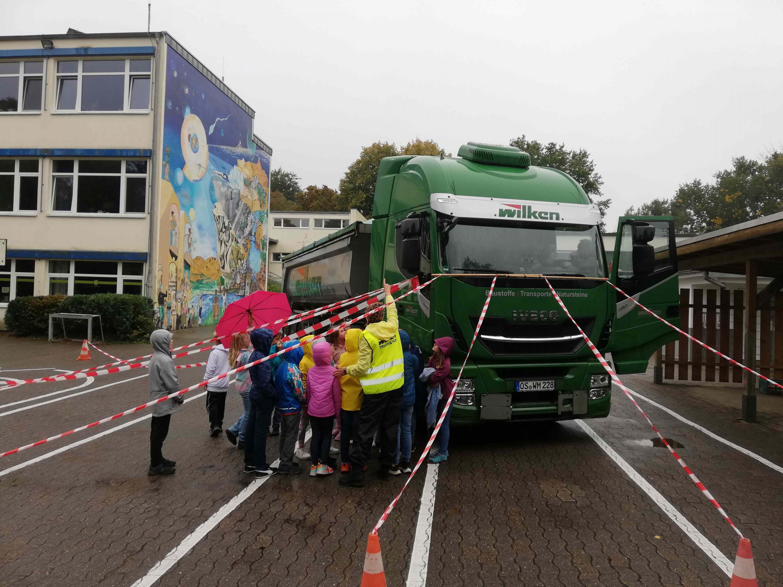 Den ganzen Vormittag nahmen sich Herr Frau und Frau Wilken mit einem Ihrer großen LKWs Zeit, um auf dieses wichtige Thema aufmerksam zu machen. Sehr geduldig und mit WOW-Effekt konnten die Kinder erleben, was der tote Winkel im Alltag bedeutet.