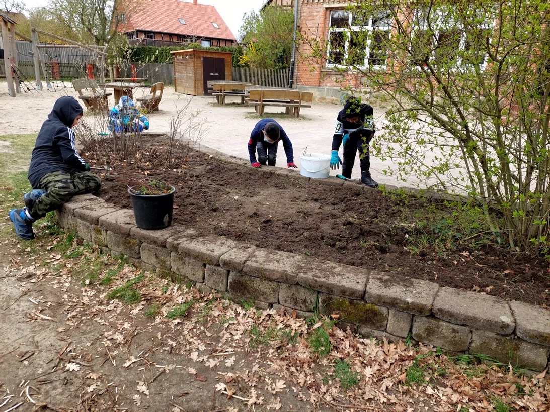 Die Schüllerinnen und Schüler des dritten Jahrgangs haben gemeinsam insektenfreundliche Beete angelegt. Hierzu haben sie zunächst das Beet auf dem Schulhof in Woltorf vom Unkraut befreit und dann mit einem kleinen Zaun versehen, so dass niemand mehr darüber läuft. Schließlich haben sie bienenfreundliche Sommerblumen eingesäht. Und jetzt ist auch schon etwas zu sehen.