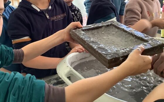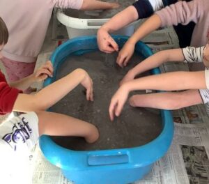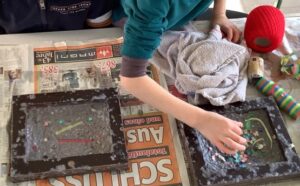 Das eingeweichte Papier musstn wir mixen und wissen nun, dass der Papierbrei „Pulpe“ heißt. Die Pulpe haben wir gesiebt. Auf dem Sieb blieb das neue Papier zurück, das wir mit Glitzer, Konfetti und Gräsern dekorieren konnten. Es hat ganz viel Spaß gemacht und wir haben viel über das Thema „Müllvermeidung“ gelernt.