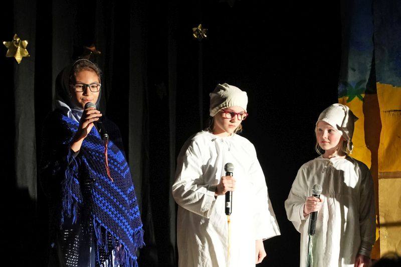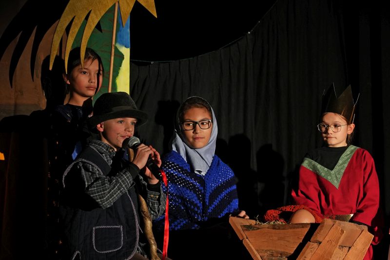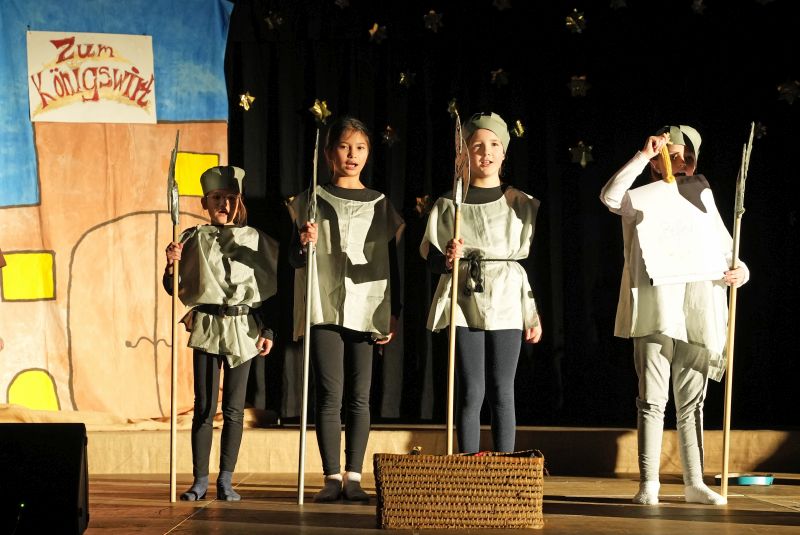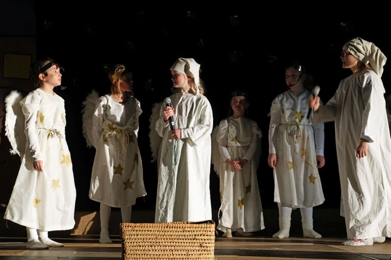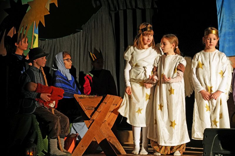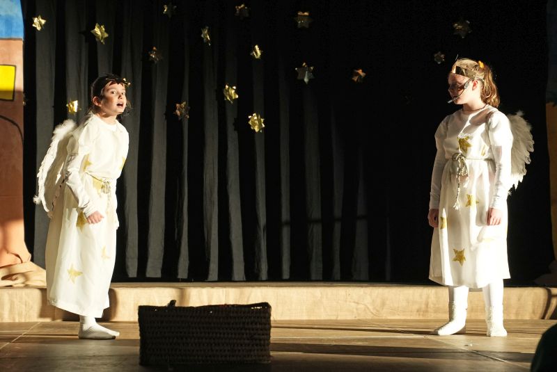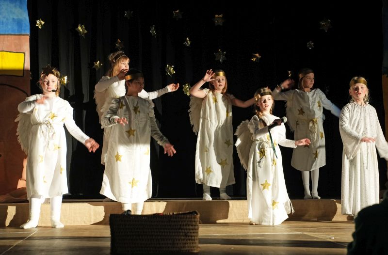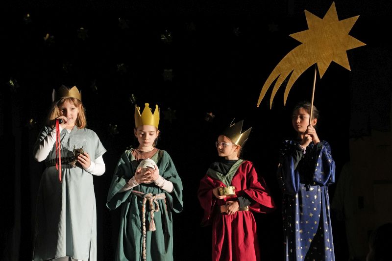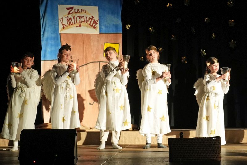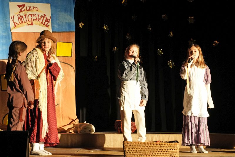 Am 16. Dezember ging der Vorhang auf in der großen Turnhalle. Die Kinder der Theater-AG führten mit Unterstützung des Chores das diesjährige Weihnachtsmusical “Kein Zimmer frei in Bethlehem” auf. Auch die Kinder der 1. Klassen hatten vorher einen kleinen leuchtenden Auftritt.