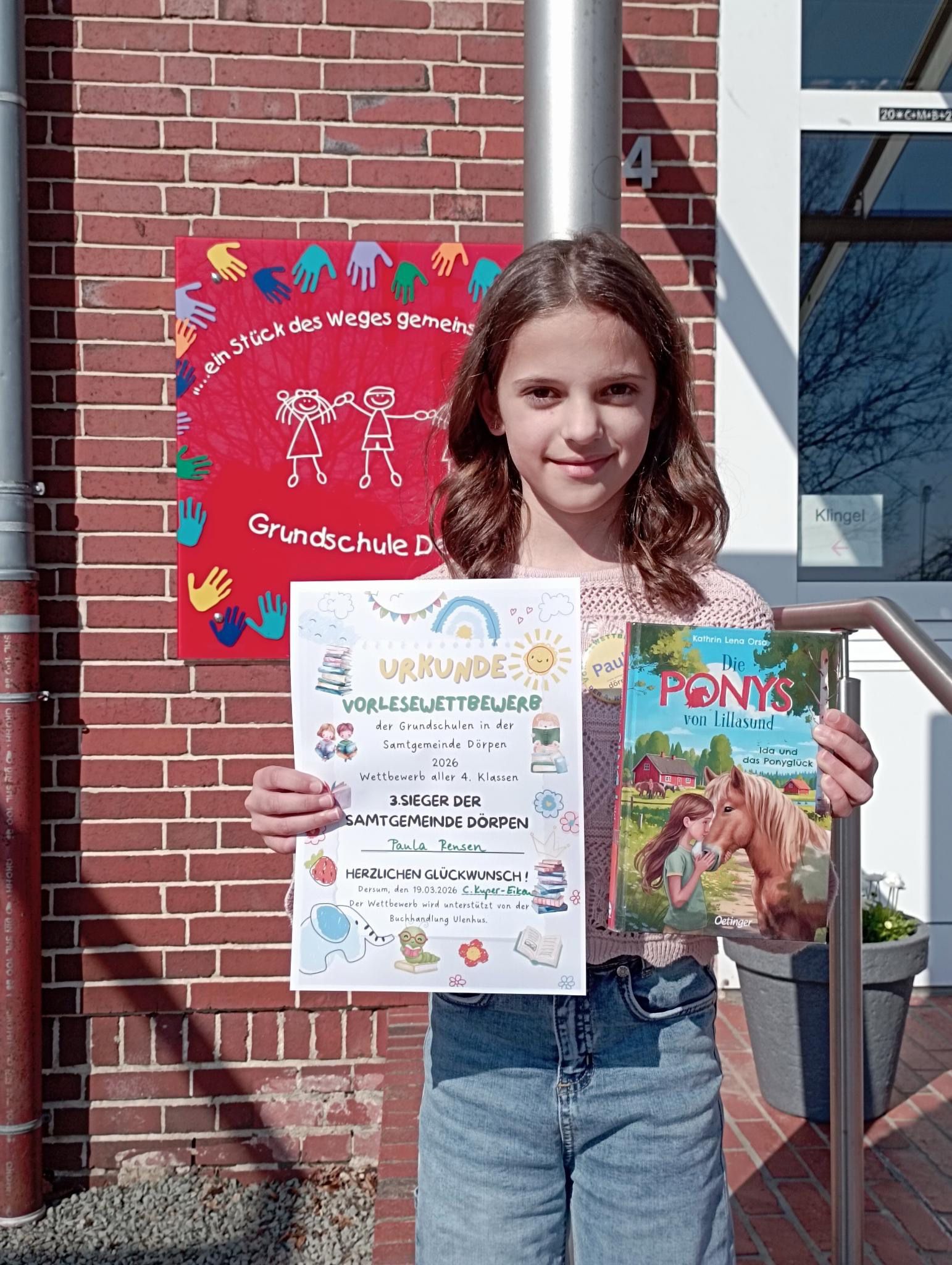 Unsere Schulsiegerin Paula Rensen hat heute erfolgreich am Vorlesewettbewerb der Grundschulen im Schulverbund teilgenommen. Mit viel Ausdruck, Lesefreude und einer tollen Präsentation ihres Textes konnte sie die Jury überzeugen und erreichte einen hervorragenden 3. Platz. 🥉