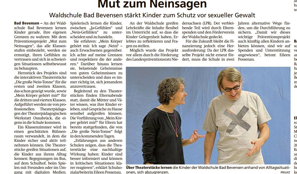 In diesem Schuljahr fand vor den Herbstferien für alle Schülerinnen und Schüler der Waldschule ein Präventionsprogramm statt. Im Jahrgang 1 und 2 wurde das interaktive Theaterstück die “Nein-Tonne” gezeigt, für die Klassen 3 und 4 gab es das Programm “Mein Körper gehört mir”