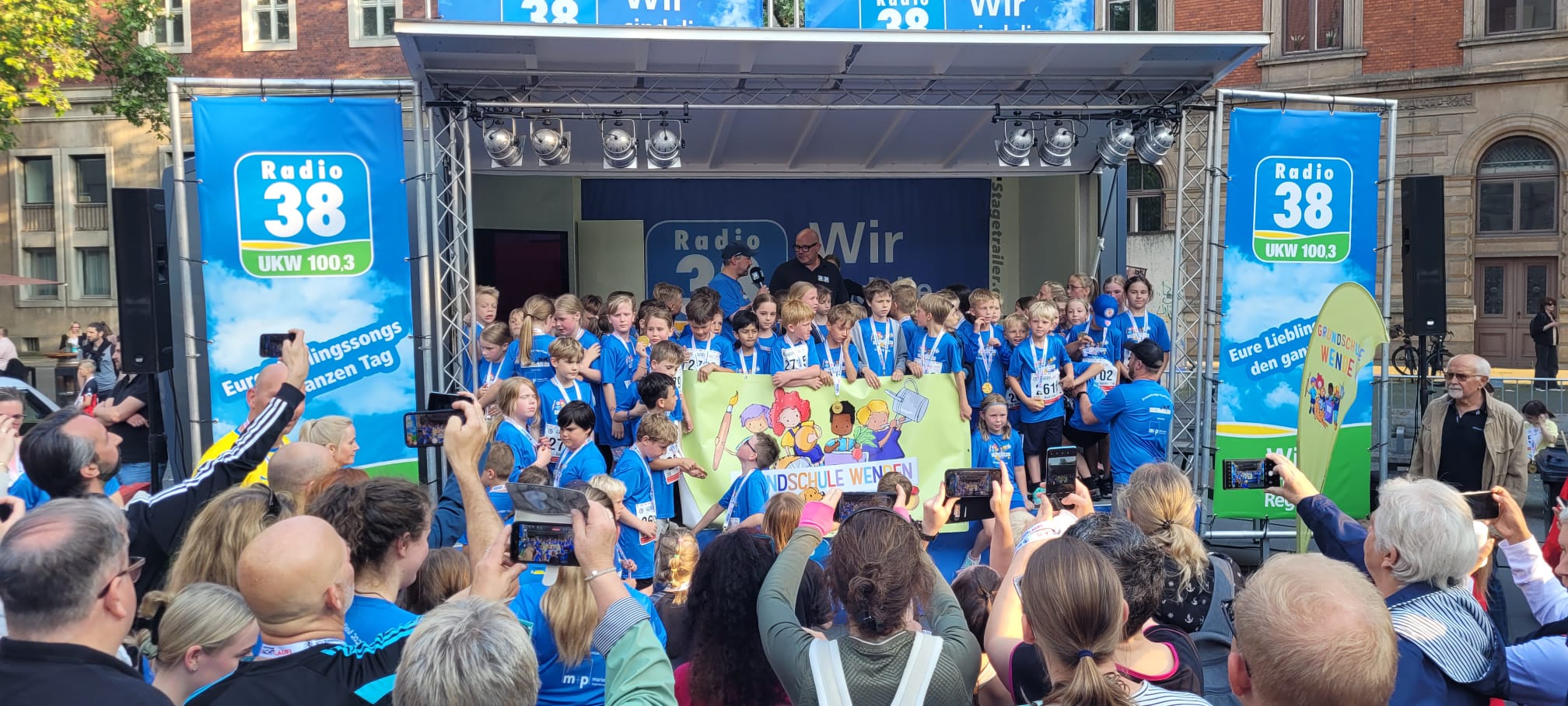 Alle Kinder haben den Parcours mit großer Freude, Motivation, Ausdauer und tollen Platzierungen absolviert, so dass sie stolz ihre Medaillen nach dem Zieleinlauf in Empfang nehmen konnten. Anschließend versammelten sich alle vor und auf der Bühne von Radio 38 auf dem Platz der Deutschen Einheit. Da wir in diesem Jahr mit so vielen Läuferinnen und Läufern dabei waren, wurden wir als drittgrößtes Grundschulteam mit einem Preis (Gutschein für Sportartikel) geehrt. Herzlichen Dank für die zahlreichen Anmeldungen! 😊