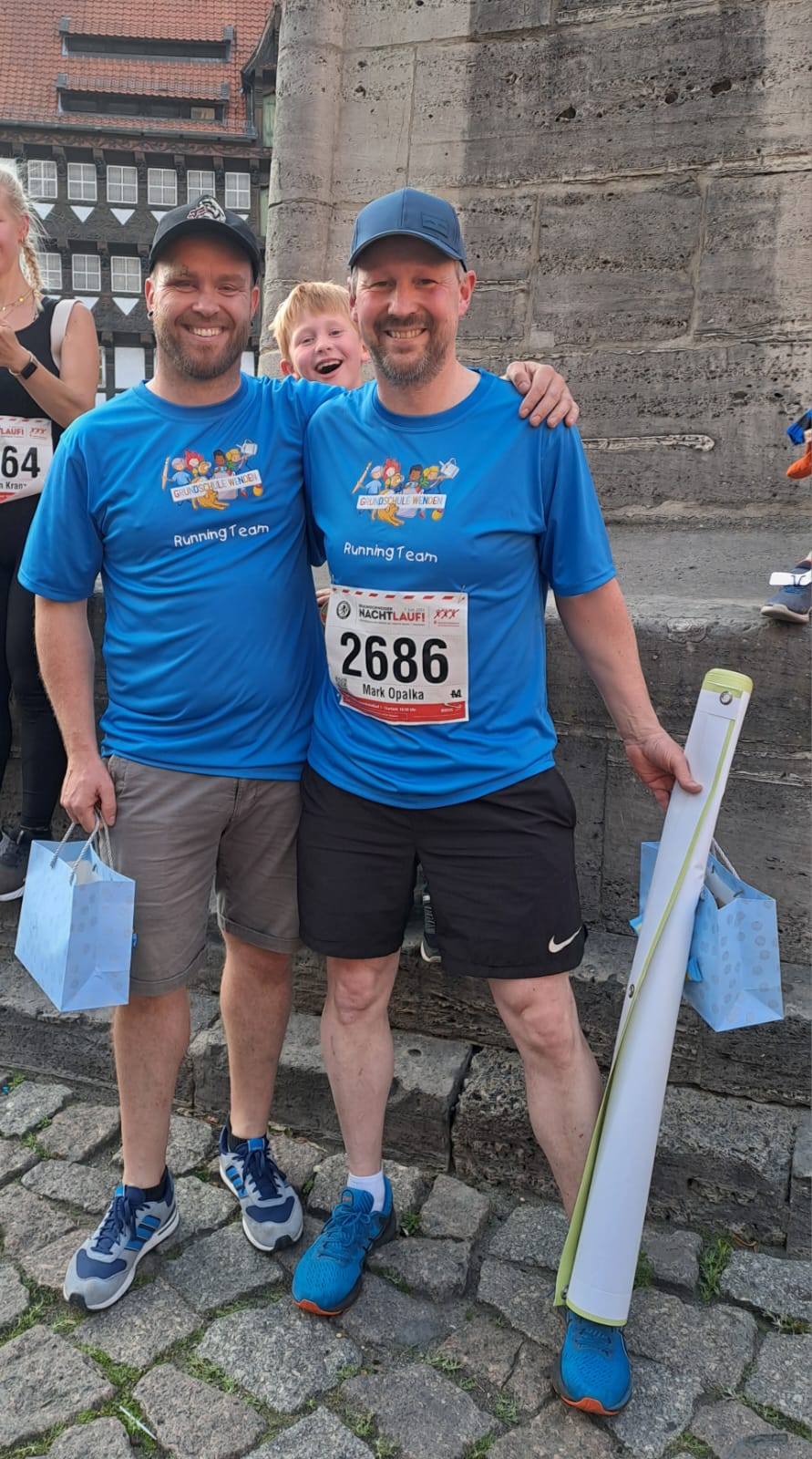 Der 3,35 km lange Rundkurs führte wieder durch die Braunschweiger Innenstadt, über den Marstall, Neue Straße, Altstadtmarkt, Kohlmarkt und Damm bis zum Ziel am Schloss. Der Nachtlauf ist bekannt für seine besondere, einmalige Atmosphäre. So standen an der Strecke etliche Zuschauer, die uns kräftig angefeuert und applaudiert haben. Es wurde sogar getrommelt und musiziert. Und am Kohlmarkt, rund 1 km vor dem Ziel, konnten sich die Kids einen zusätzlichen Energieschub durch Abklatschen eines originellen Buttons abholen.