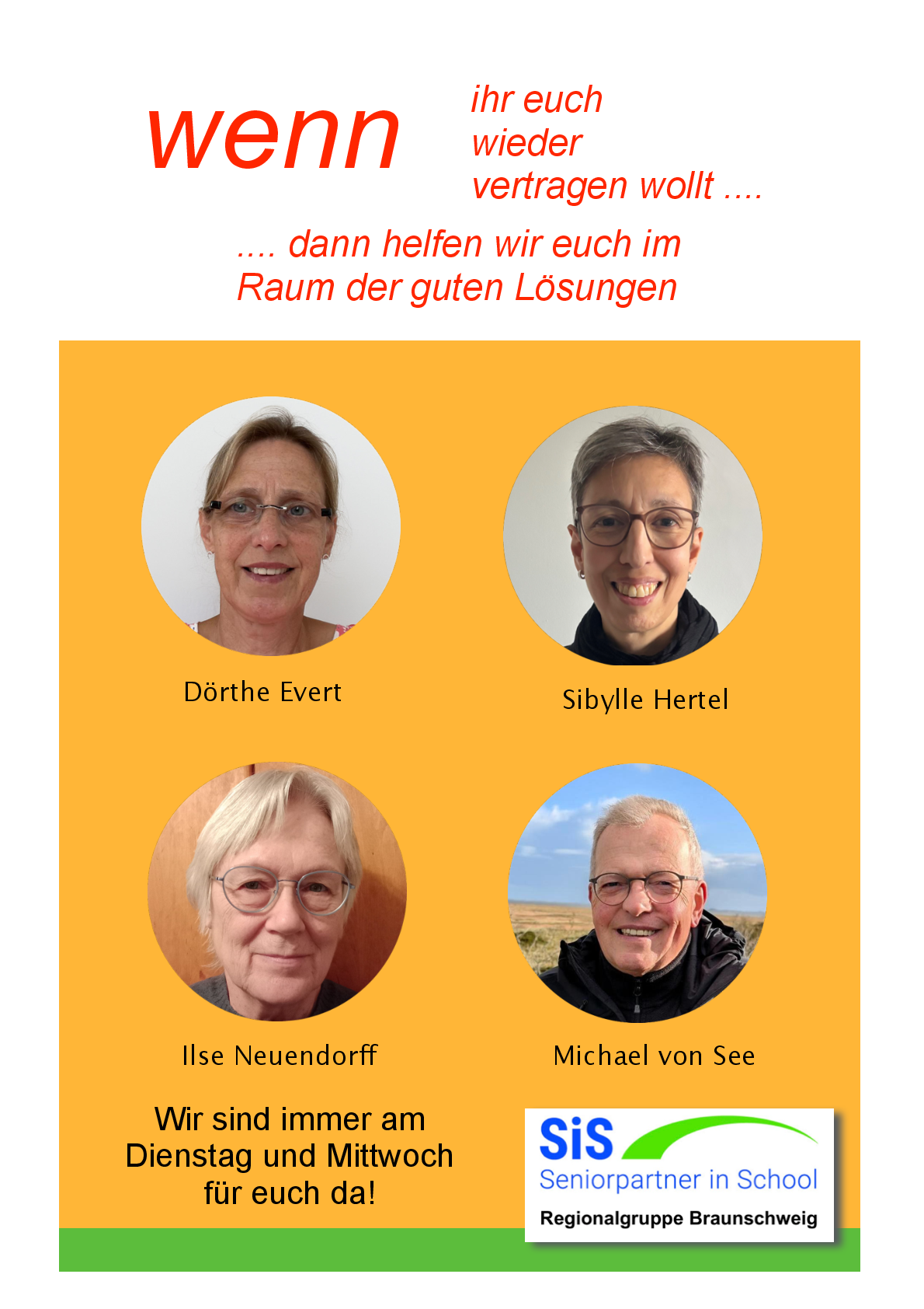 Seit Kurzem wird unsere Schule durch das Projekt Seniorpartner in School (SiS) unterstützt. Ausgebildete Schulmediatorinnen und -mediatoren kommen jeden Dienstag und Mittwoch vormittags in Zweierteams zu uns und helfen den Kindern bei Streit, Sorgen und Konflikten.