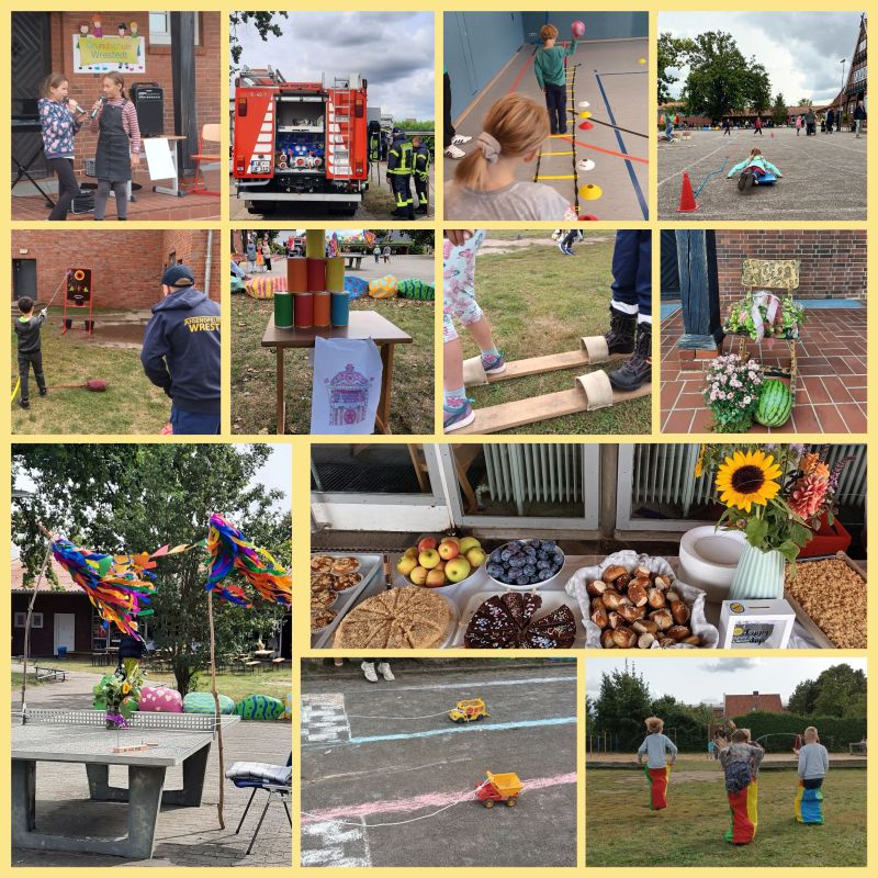 Obwohl sich das Sommerfest dank Wind, Wolken und Kälte eher wie ein Herbstfest anfühlte, hatten alle Gäste viel Spaß. Es wurde nicht langweilig, denn an insgesamt 13 Stationen konnten die Kinder (und auch einige mutige Erwachsene) den ganzen Nachmittag spielen. Die Stationen wurden vorbereitet und betreut von den Schulklassen, vom TSV Wrestedt/Stederdorf (Handball, Fußball, Leichtathletik), vom Tennisclub Wrestedt und von der Jugendfeuerwehr. Der Elternförderkreis hatte eine Hüpfburg organisiert, bot Kinderschminken an und sorgte mit einem riesigen Kuchenbuffet für das leibliche Wohl der Gäste. Vielen Dank an alle Eltern, die dieses Buffet durch ihre zahlreichen Kuchenspenden ermöglicht haben! Ergänzt wurde dieses umfangreiche Angebot von verschiedenen Tänzen, Gesangsdarbietungen, einer Versteigerung von dekorierten Schulstühlen und einem Feuerwehrauto zum Anfassen.