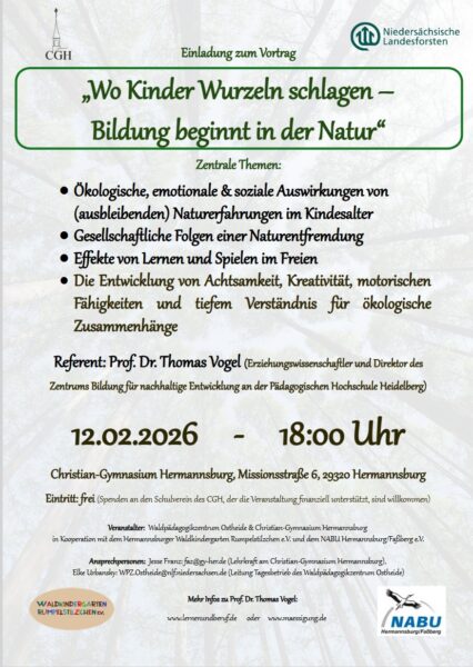 ist der Titel eines Vortrags, den der Erziehungswissenschaftler Prof. Dr. Thomas Vogel von der Pädagogischen Hochschule Heidelberg am Christian-Gymnasium Hermannsburg am 12. Feburar halten wird. Zur Sprache kommen ökologische, emotionale und soziale Auswirkungen von Naturerfahrungen im Kindesalter – und die Folgen ihres Ausbleibens, sowohl für das einzelne Kind als auch die Gesellschaft. Außerdem geht es um die Effekte von Lernen und Spielen im Freien, die Entwicklung von Achtsamkeit, Kreativität, motorischen Fähigkeiten sowie eines tiefen Verständnisses für ökologische Zusammenhänge.