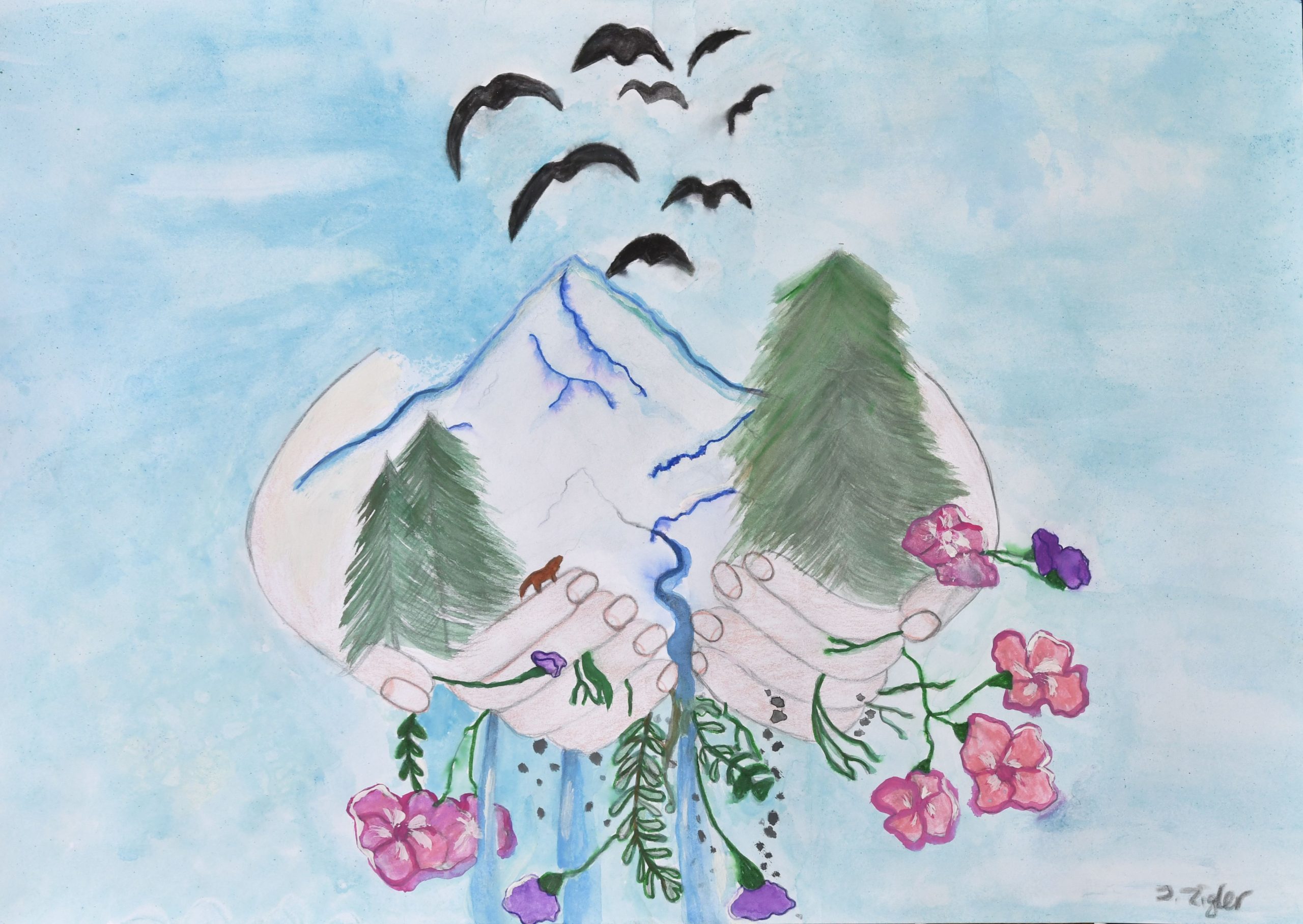„Hand in Hand mit der Natur“ – so lautete das Motto im Kunst-WPU. Insgesamt haben sich 25 Schüler beteiligt. Nach einer inhaltlichen Auseinandersetzung haben die Schüler thematisch verwandte Beispiele der Darstellenden Kunst, wie die Landschaftsmalerei des Barock und die Land Art, untersucht. Bei der Gestaltung eigener Werke ging es zunächst darum, geeignete Motive zu finden. Kursleiter Andreas Schniederalbers berichtet: „Außerdem stellte die Wahl der Umsetzung eine Herausforderung dar, da hier malerische, zeichnerische, plastische und auch Kompetenzen im Bereich Film und Fotografie gefragt waren und man sich für einen Bereich entscheiden musste.“ Die Erwartungen des Kunstlehrers wurden in hohem Maße erfüllt, es seien teilweise ausgezeichnete und überwiegend gute Ergebnisse entstanden. Herr Schniederalbers ist vom Konzept des Europa-Wettbewerbs überzeugt: „Die aktuellen Entwicklungen im Bereich Klima und Politik zeigen auf, dass der Europäische Wettbewerb brandaktuelle Themen in den Fokus stellt. Die Teilnahme ermöglicht es, die Aufmerksamkeit der Schulgemeinschaft darauf zu lenken und sie hierfür zu sensibilisieren. Ich kann mir gut vorstellen, auch nächstes Jahr wieder teilzunehmen.“