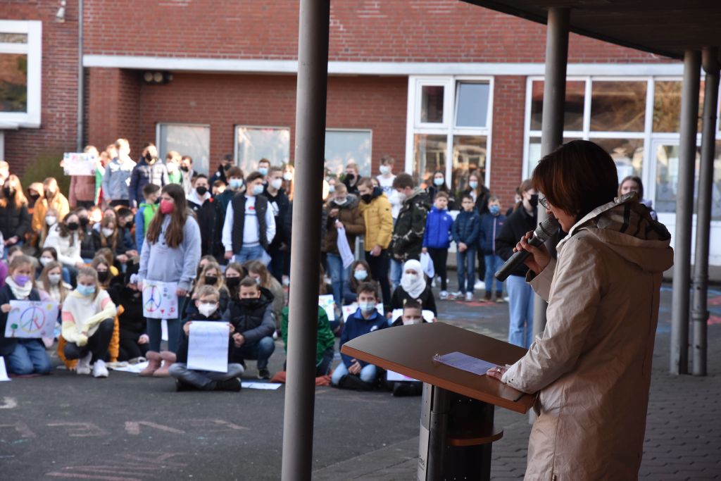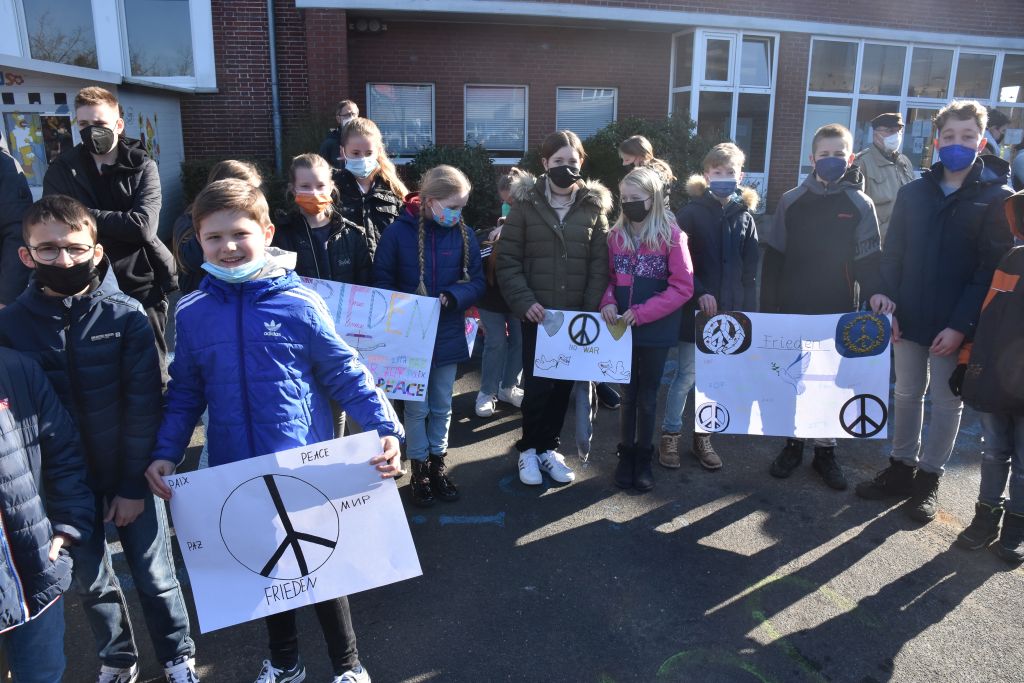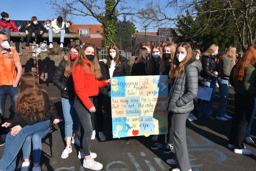 Umso mehr hat es uns gefreut, großes Engagement und Mitarbeit bei den Schüler:innen zu sehen. In zwei Unterrichtsstunden haben sich die Schüler:innen begleitet von ihren Fachlehrer:innen mit der derzeitigen Situation in der Ukraine sowie grundsätzlich mit dem Thema Krieg oder auch Fake News auseinandergesetzt. Als sichtbares Ergebnis wurden viele schöne Plakate und Banner teilweise in mühevoller Arbeit gestaltet. Außerdem konnten die Schüler:innen Wünsche und Bitten formulieren. So wurden viele Friedenswünsche eingereicht, die den Flüchtenden, dem Frieden und dem Zusammenhalt galten. Diese wurden im Rahmen einer kleinen Gedenkveranstaltung vorgetragen. Umrahmt wurde die Veranstaltung durch musikalische Beiträge, unter anderen von Maxime Swinkels sowie einer Schweigeminute.