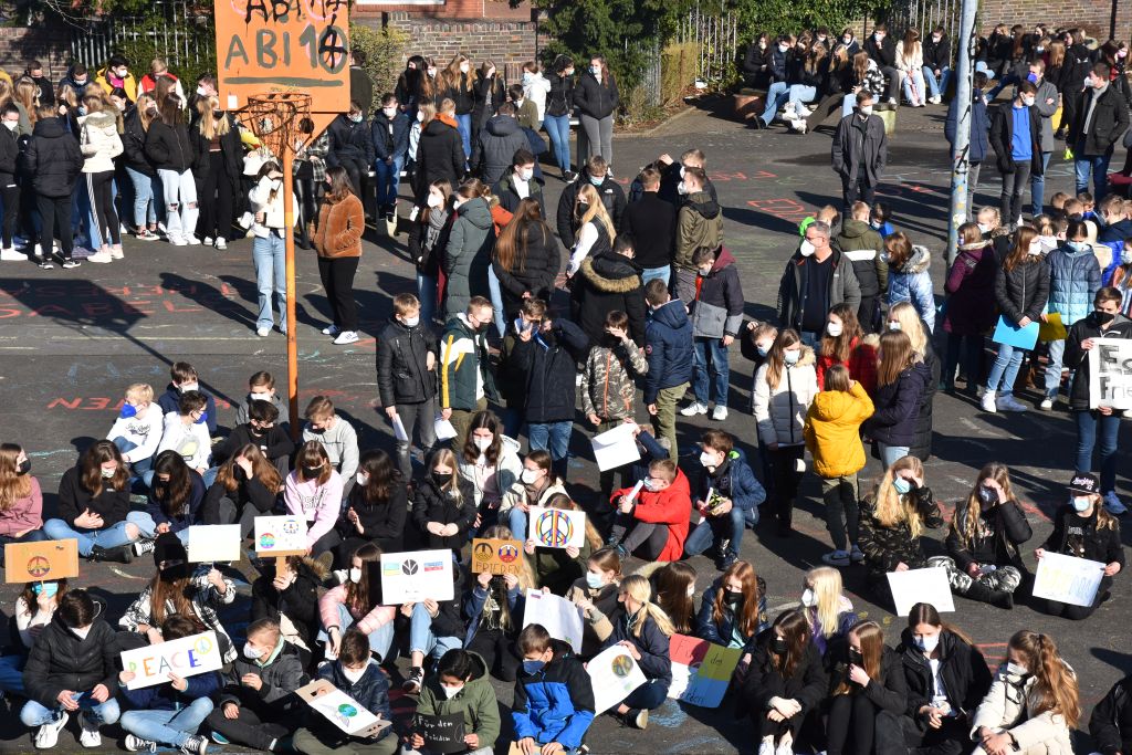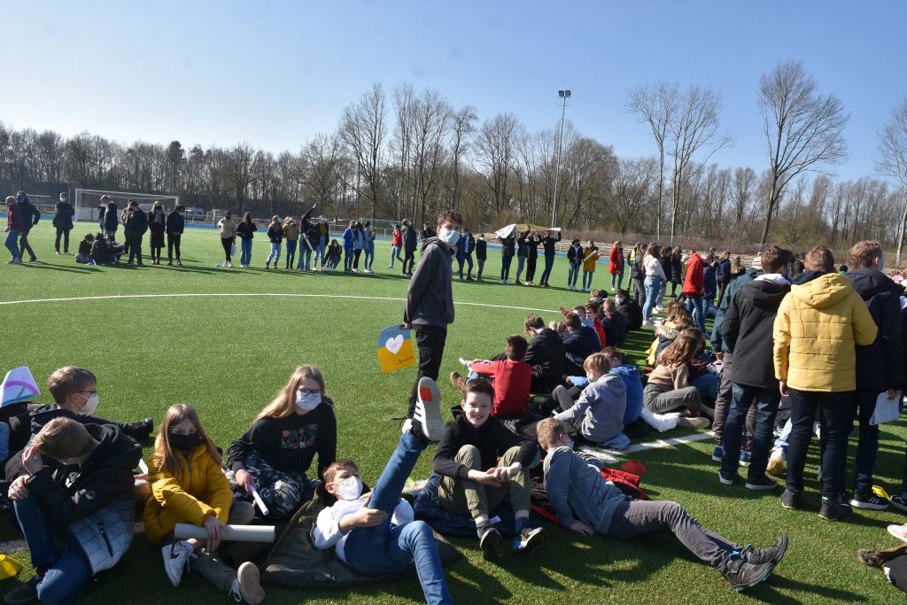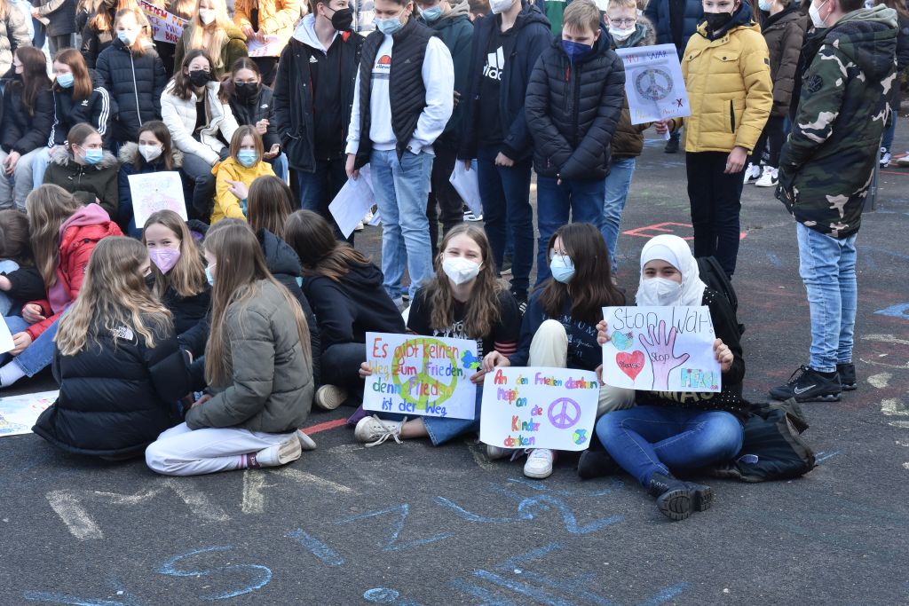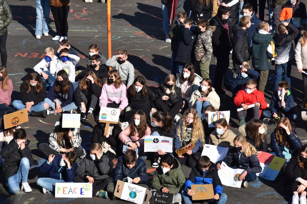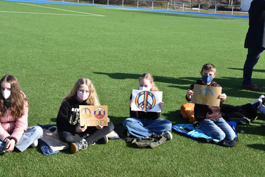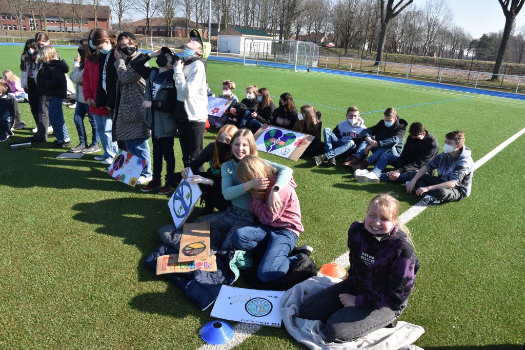 Am vergangenen Freitag, dem 18.03.2022, fand auf unserem Schulhof und im Leichtathletikstadion eine umfangreiche Friedensaktion statt, die von der Schülervertretung unter der Regie von Isabelle Schollas und Vanessa Lorenz geplant und durchgeführt worden ist.