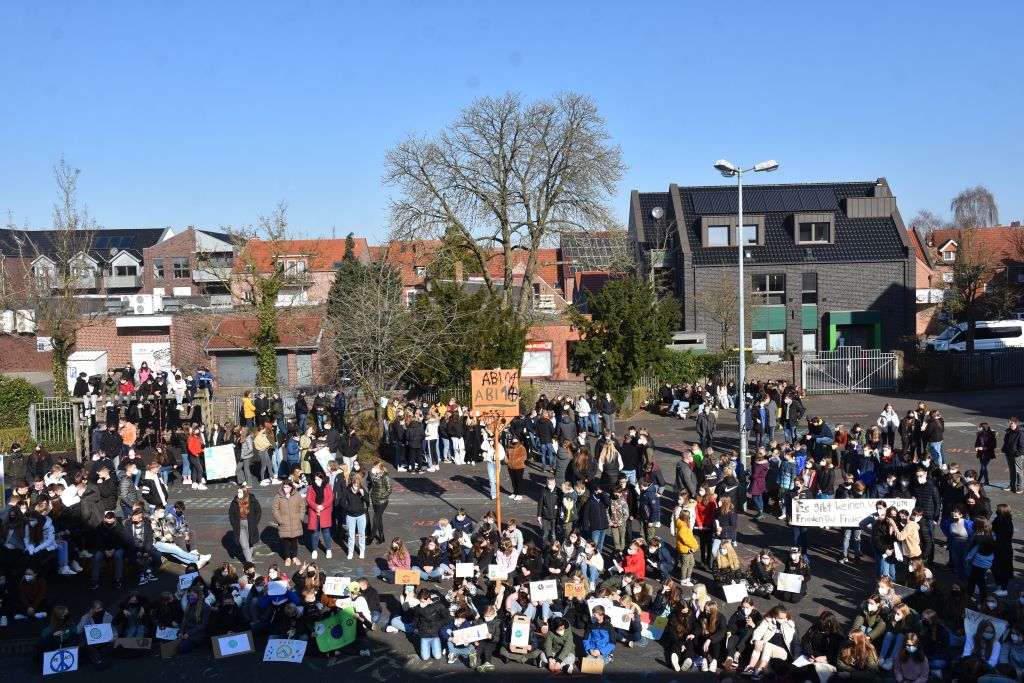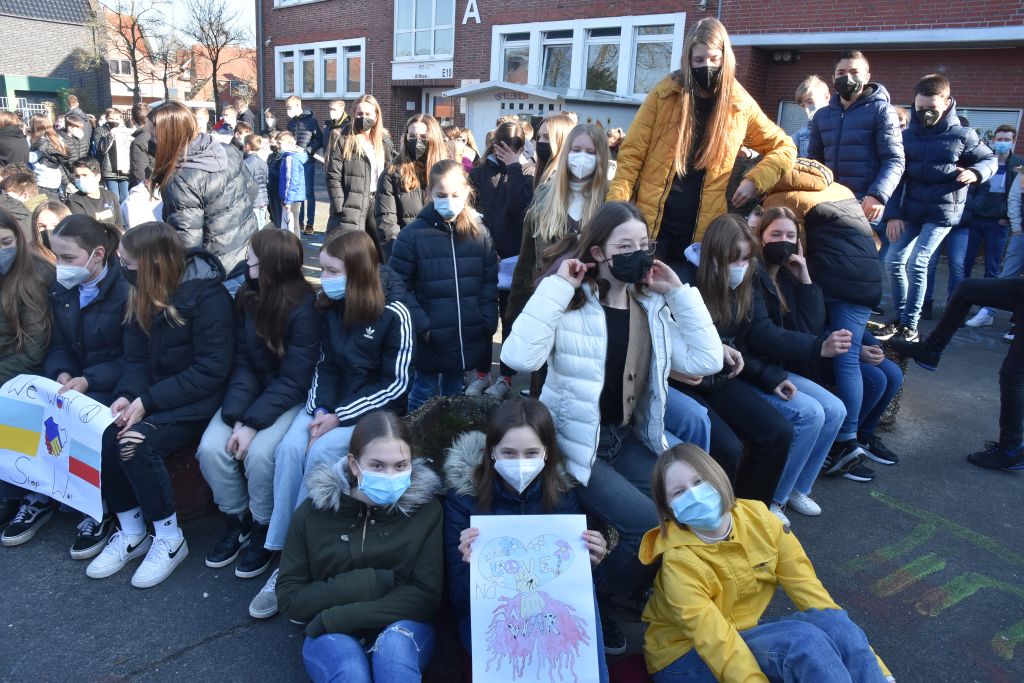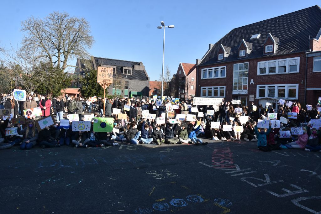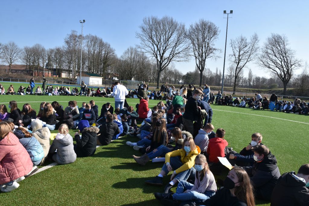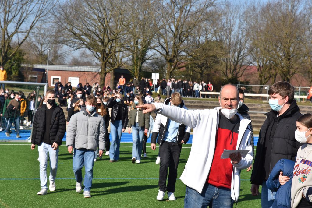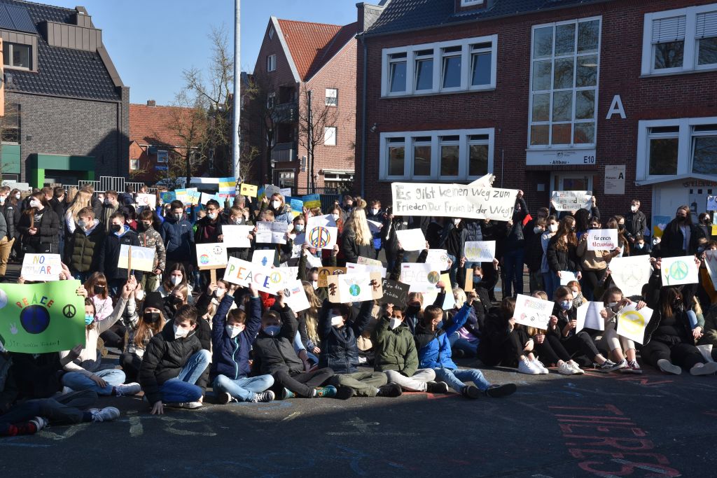 Am vergangenen Freitag, dem 18.03.2022, fand auf unserem Schulhof und im Leichtathletikstadion eine umfangreiche Friedensaktion statt, die von der Schülervertretung unter der Regie von Isabelle Schollas und Vanessa Lorenz geplant und durchgeführt worden ist.