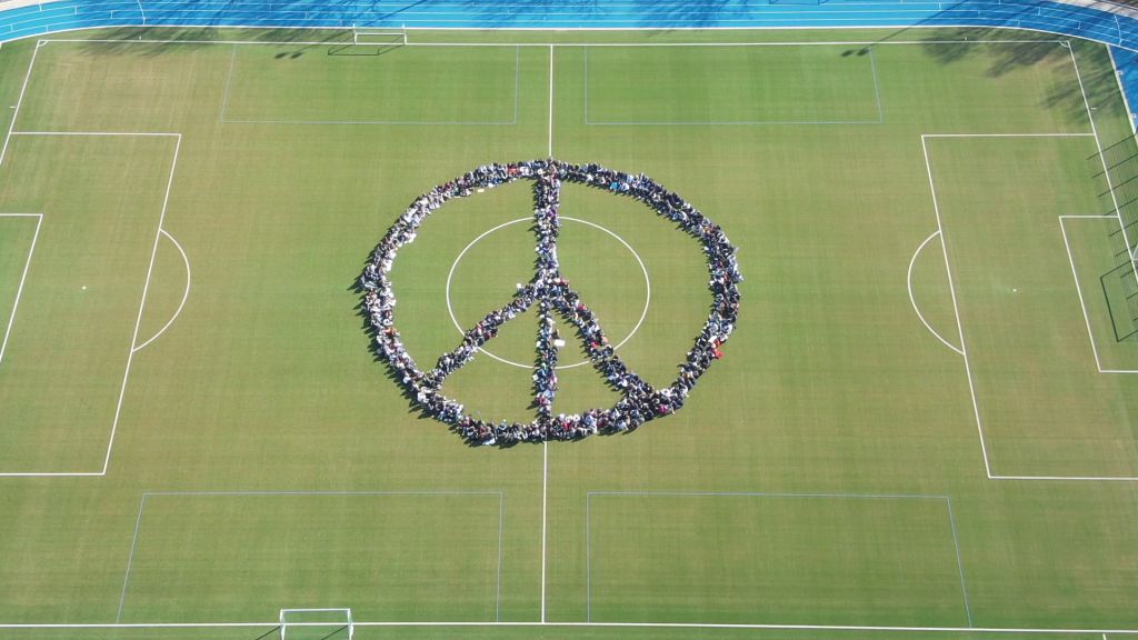 Anschließend hat sich die ganze Schulgemeinschaft auf den Weg ins Stadion gemacht, wo fast 600 Schüler:innen gemeinsam das Peace-Symbol gebildet haben.