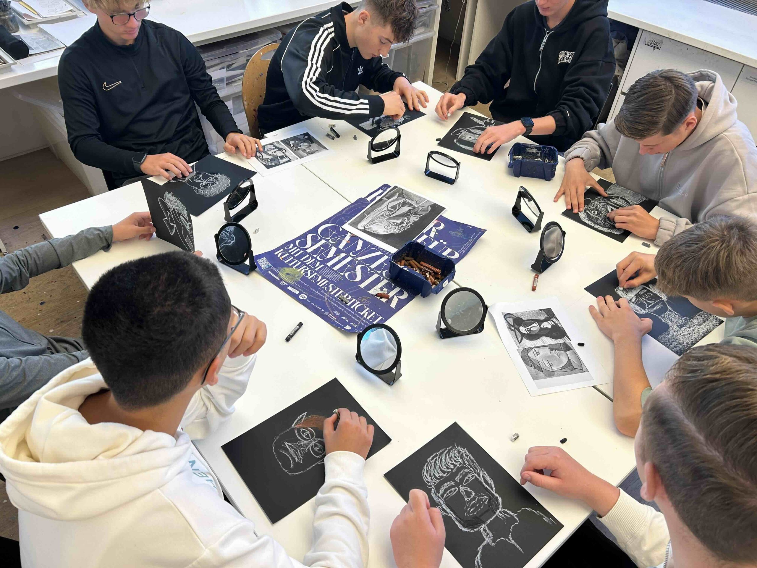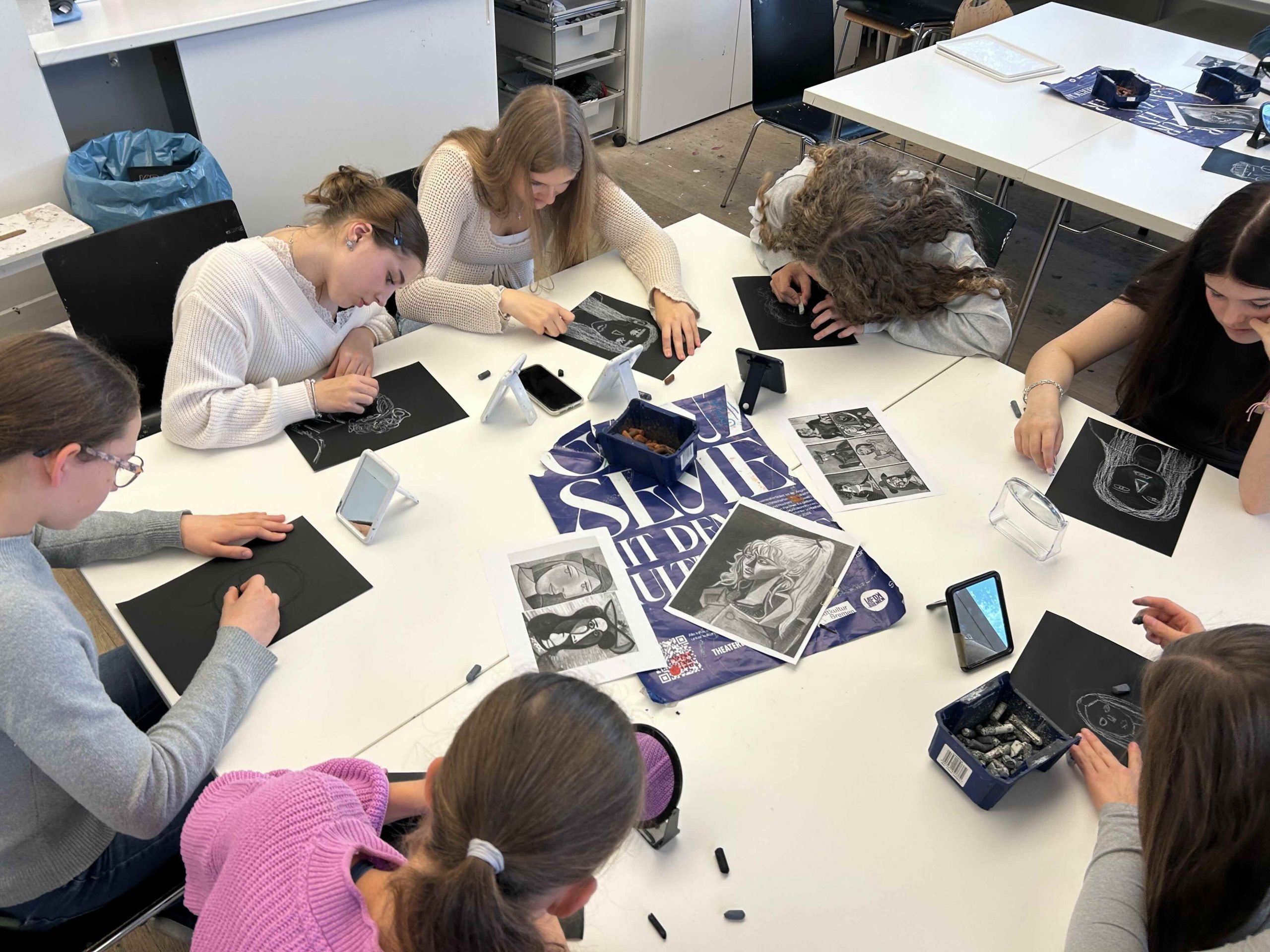 Nach einer turbulenten Fahrt mit der “Bahn” nach Bremen hatten die 10. Klassen eine tolle Führung zum Thema “Porträt” und haben in einem anschließenden Workshop ihrer Kreativität freien Lauf gelassen und kubistisch angehauchte Selbstporträts sowie Porträts ihrer Lehrkraft erstellt.
