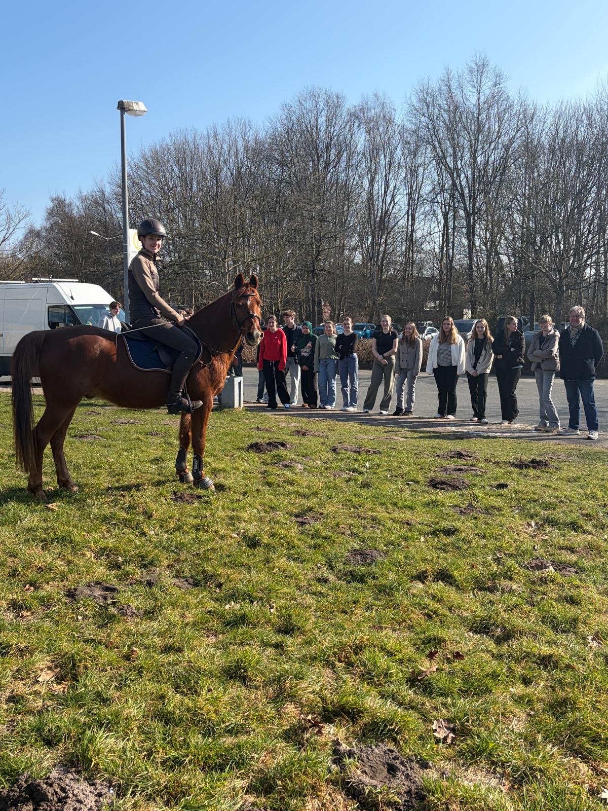 Am 05.03.2026 haben wir Winnie, das Pony von Lana im Rahmen unserer Sportpräsentation unserer Klasse gezeigt. Wir hatten für unsere Präsentation das Thema „Reiten“ gewählt, da wir beide sehr gerne reiten und wir uns sehr dafür interessieren. Für unseren praktischen Teil der Präsentation haben wir uns dann überlegt, dass es schön wäre, wenn unsere Klasse auch sieht wie man richtig reitet. So sind wir auf die Idee gekommen, dass es schön wäre, Winnie mitzunehmen. Lana hat dann verschiedene Gangarten gezeigt, so ist sie zum Beispiel getrabt oder galoppiert und Winnie hat verschiedene Tricks aufgeführt. Wir sind sehr dankbar, dass es so möglich war und wir Winnie mitbringen durften.
