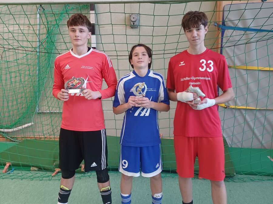 1 Treffer: Luca Schröder (Humboldt-Gymnasium) Jan Kuhlmann (Alfeld) Cornelius Reinsch (Pattensen) Bjarne Wolf, Julius Edler (KGS II) Ilyas Özyertsel (Alfeld) Nevio Widerstein (Humboldt-Gymnasium) Sunat Botpaev (Schiller-Gym) Davor Majanovic (Elisabeth-Belling-GS)