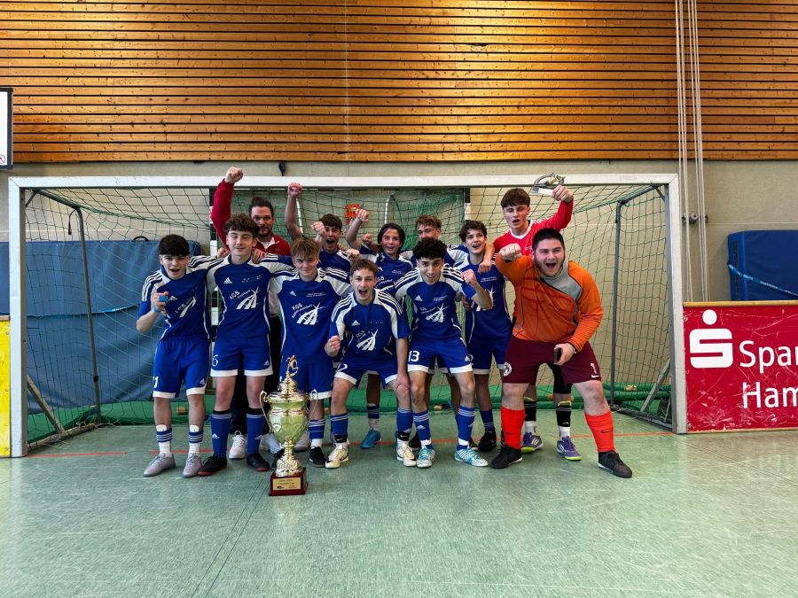 Im mit Spannung erwarteten Finale der beiden besten Teams des Turnieres zwischen der KGS Salzhemmendorf und dem Gymnasium Alfeld führte der zweite Angriff der Alfelder Gymnasiasten durch Damian Dill zur frühen 1:0-Führung. Die KGS-ler schüttelten sich jedoch nur kurz, spielten ruhig weiter und dann hatte der zuvor noch zurückhaltend agierende Achtklässler Oliver Stanislawek seinen großen Auftritt: Binnen vier Minuten erzielte der talentierte Linksfüßer mit drei wunderschönen Treffern einen lupenreinen Hattrick zur 3:1-Führung der Gastgeber. Als dann der umtriebige Wirbelwind Giovanni Brunstermann noch das 4:1 nachlegte, war die Messe gelesen. Zwar konnte Jorris Richter für die Leinestädter noch zum 2:4 verkürzen, doch Sekunden später ging der Schlusspfiff im kollektiven Jubelsturm unter – die KGS hat den Cup nach sieben langen Jahren wieder nach Hause geholt!
