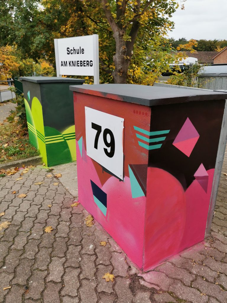 Die Schüler*innen der Sekundarstufe 2 hatten an 3  Tagen, mit viel Spaß und guten Ideen, die insgesamt 3 Blöcke der Hofeinfahrt neu gestaltet. Entstanden sind drei schöne, farbenfrohe Orientierungspunkte, die jetzt bestimmt auch nicht mehr übersehen und gerammt werden. Unterstützt wurden sie von Claas Hoffmann der die Schüler*innen angeleitet hat und als Graffiti-Künstler mit seiner Erfahrung unterstützt hat.