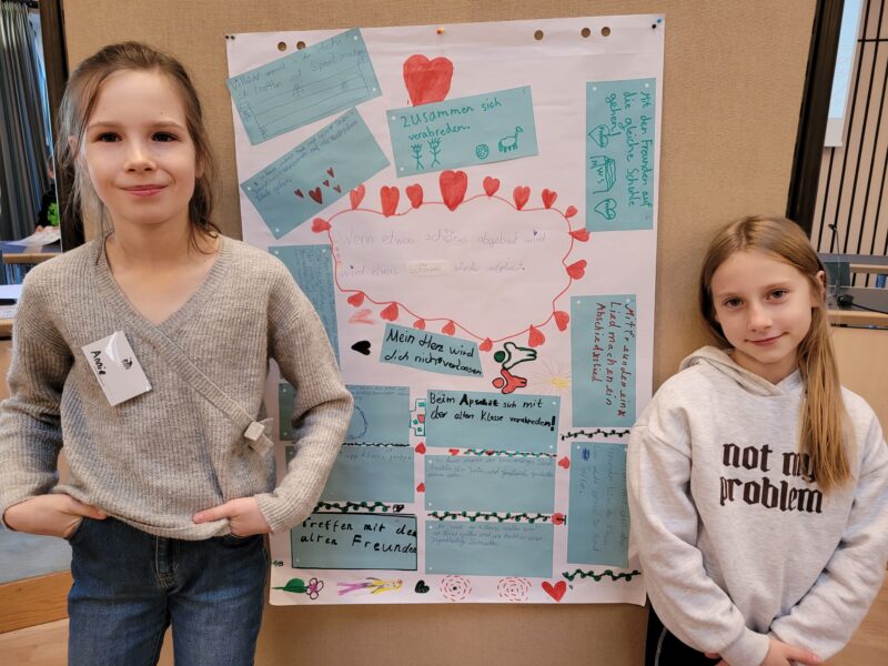 Unsere beiden gewählten Schulsprecherinnen haben an der 3. Kinderkonferenz teilgenommen und sich zusammen mit anderen Schülerinnen und Schülern über den „Übergang von Klasse 4 nach Klasse 5“ ausgetauscht. Ihre Ideen und selbst ausgedachte Mutmach-Sprüche wurden vorgestellt.
