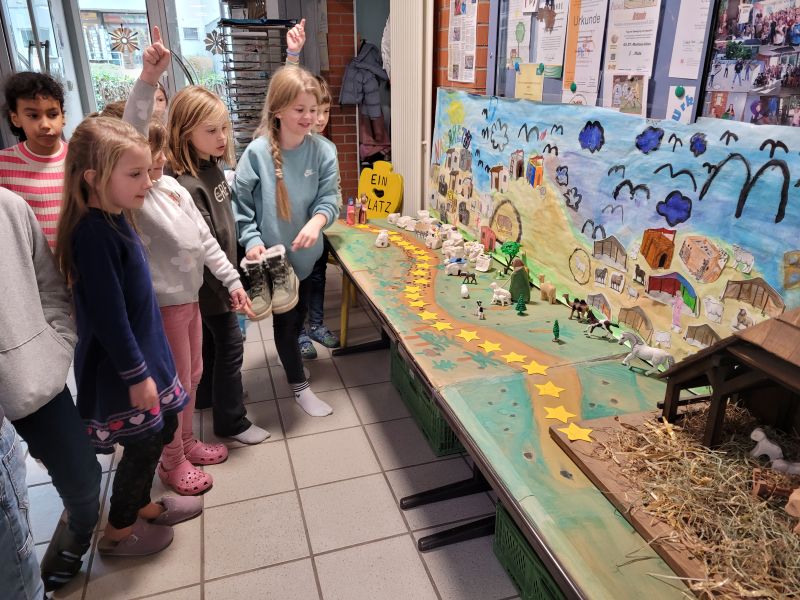 Die Kinder der Klasse 2 haben den Adventsweg gestaltet: Maria und Josef auf dem Weg nach Bethlehem.