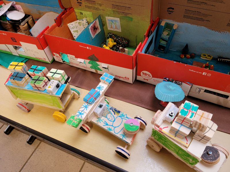 Die Kinder aus Klasse 3 haben für eine Klassen-Lichterfahrt Autos gebaut, die am Abend funkeln und leuchten. In der 4. Klasse wurden Häuser mit Inneneinrichtung und Beleuchtung gestaltet.