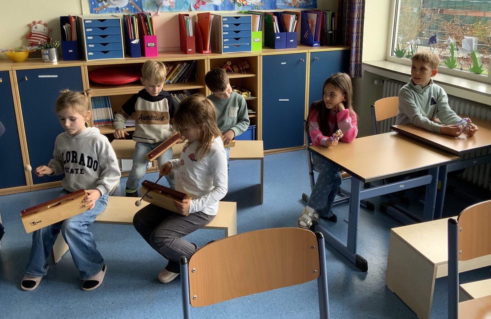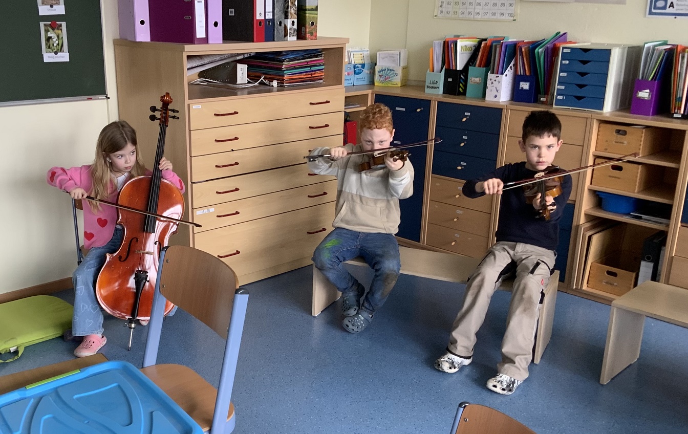 Einmal in der Woche kommt die Musikschullehrerin Frau Wolters in unsere erste Klasse. Unter dem Motto „Musik in der Schule!“ wird mit der Hälfte der Klasse im Wechsel jeweils gemeinsam gesungen, musiziert und getanzt.