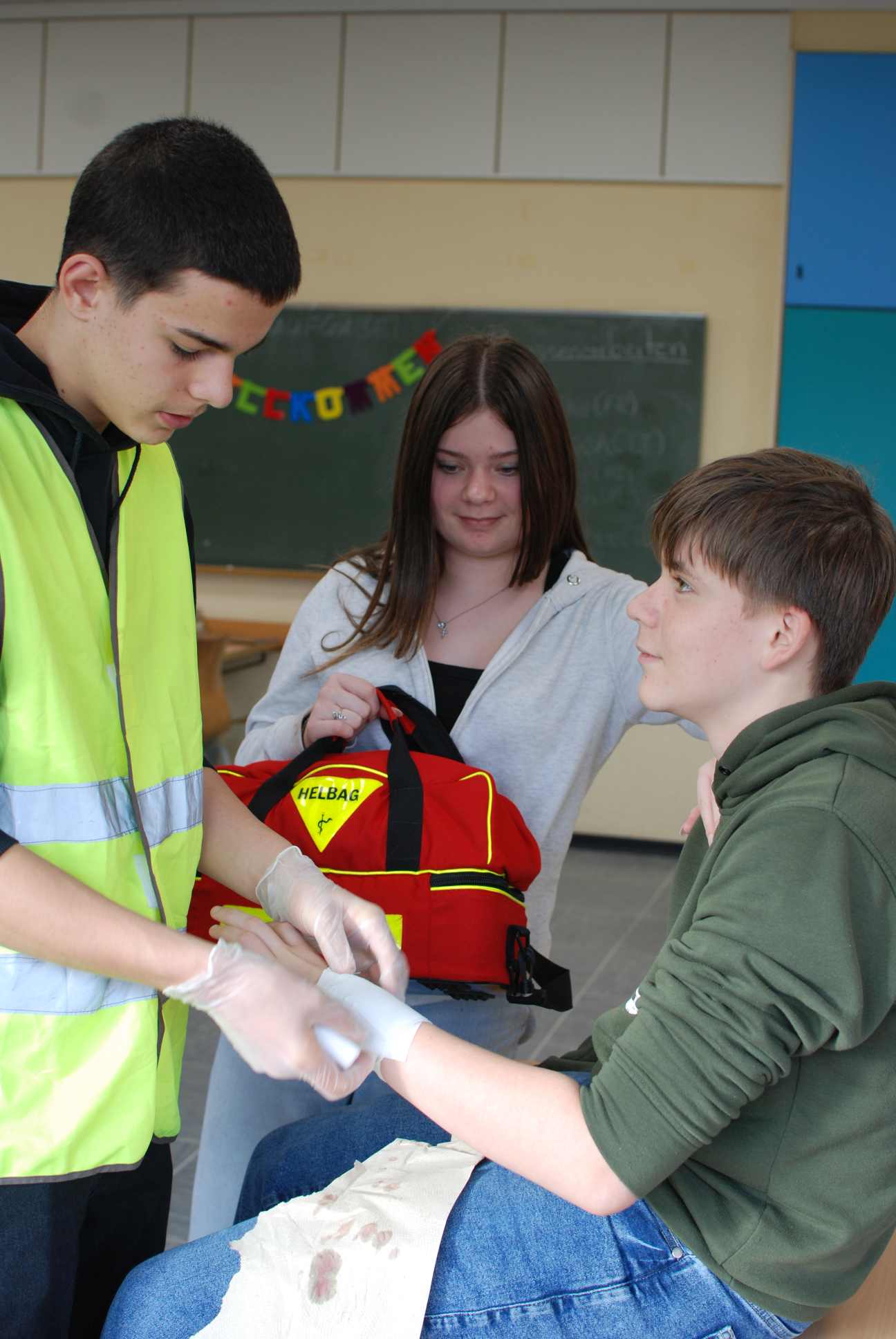 Die Ausbildung für den Schulsanitätsdienst erfolgt über eine AG, die von Frau Kuper geleitet wird. Es steht den Schüler*innen des 8. Jahrgangs offen, ob sie im Jahrgang 9 daran teilnehmen möchten.