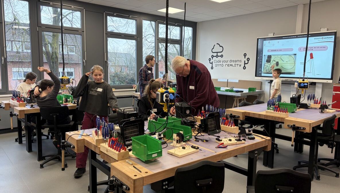 In dieser Woche tauschten die Klassen 6 jeweils an einem Tag das Klassenzimmer gegen die Wissenswerkstatt in Vechta, um das Thema Elektrizität im Physikunterricht hautnah zu erleben. Unter fachkundiger Anleitung bauten die Schülerinnen und Schüler in zwei Gruppen ihr eigenes Geschicklichkeitsspiel „Der heiße Draht“, wobei sie eigenständig löteten, schraubten und elektronische Bauteile wie LED`s und Widerstände kennenlernten.