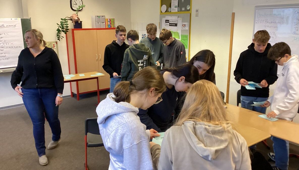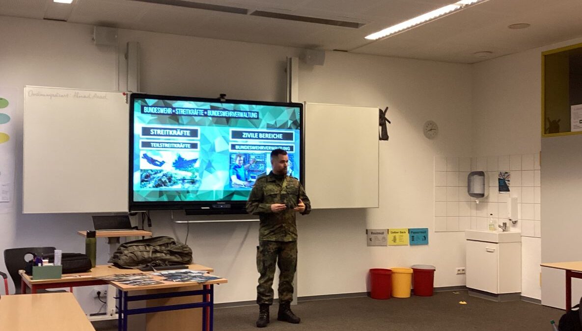 Leutnant Tobias Assert vom Karriereberatungsbüro der Bundeswehr in Cloppenburg informierte die Schülerinnen und Schüler der Klassen 9 und 10 in seinem Vortrag umfassend über die vielfältigen beruflichen Möglichkeiten innerhalb der Bundeswehr. Dabei stellte er rund 50 verschiedene Ausbildungsmöglichkeiten sowohl im militärischen als auch im zivilen Bereich vor.