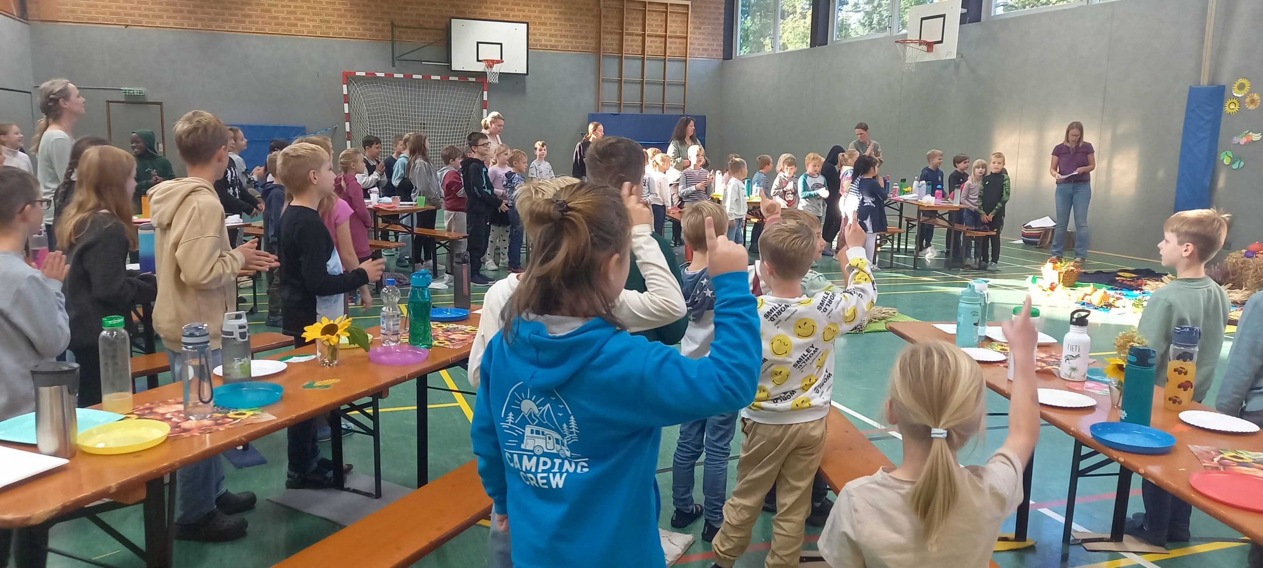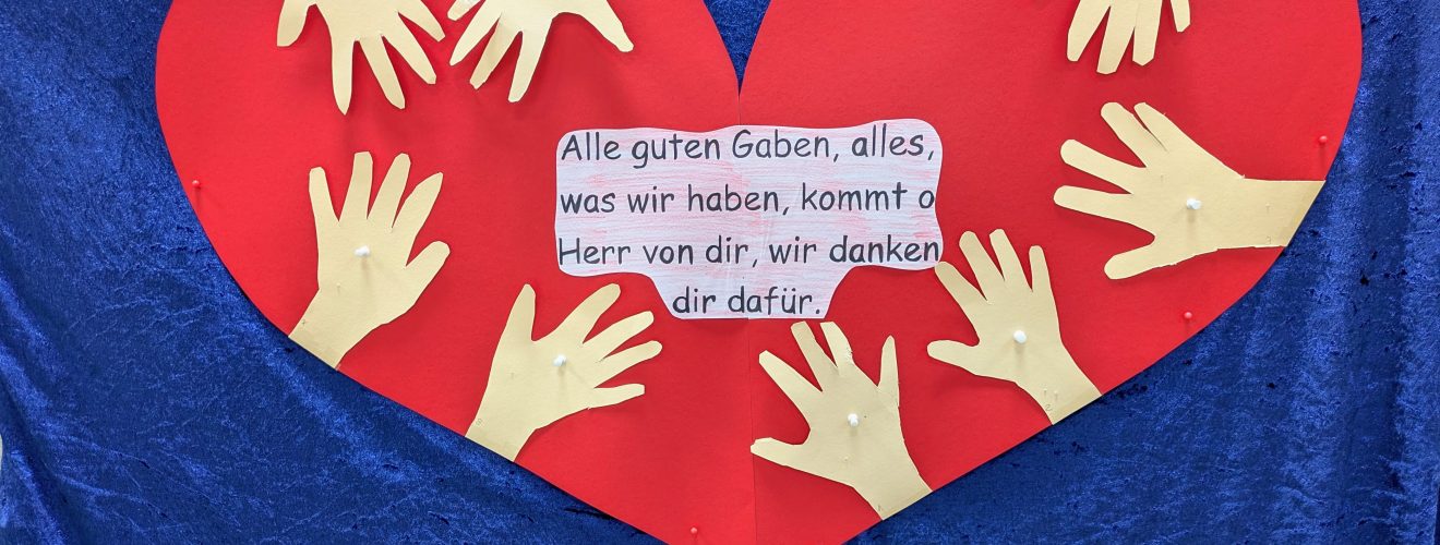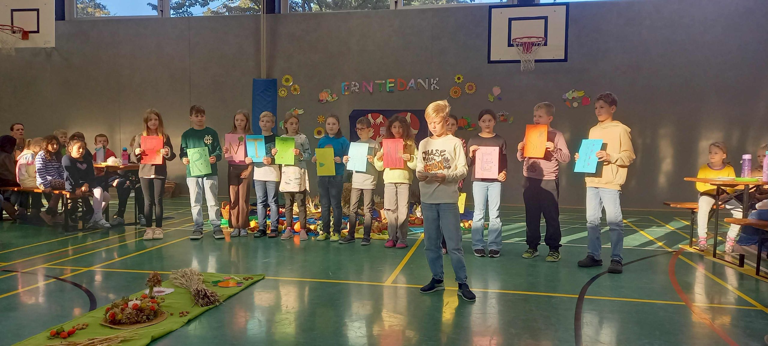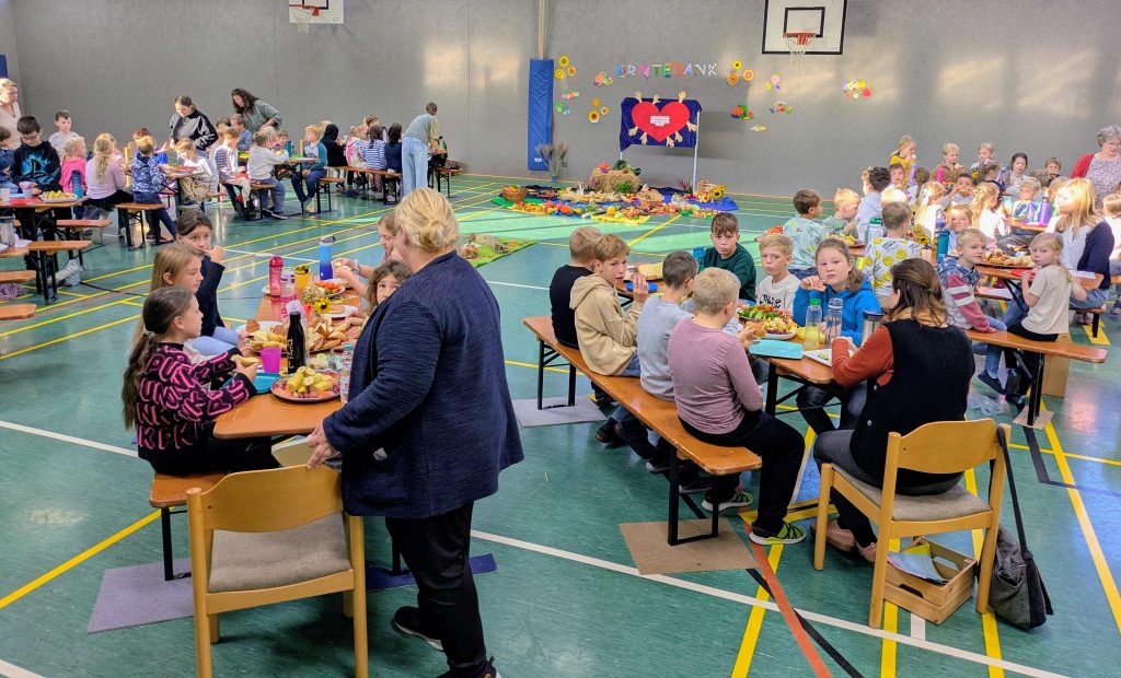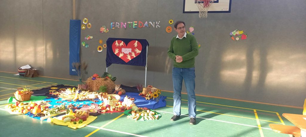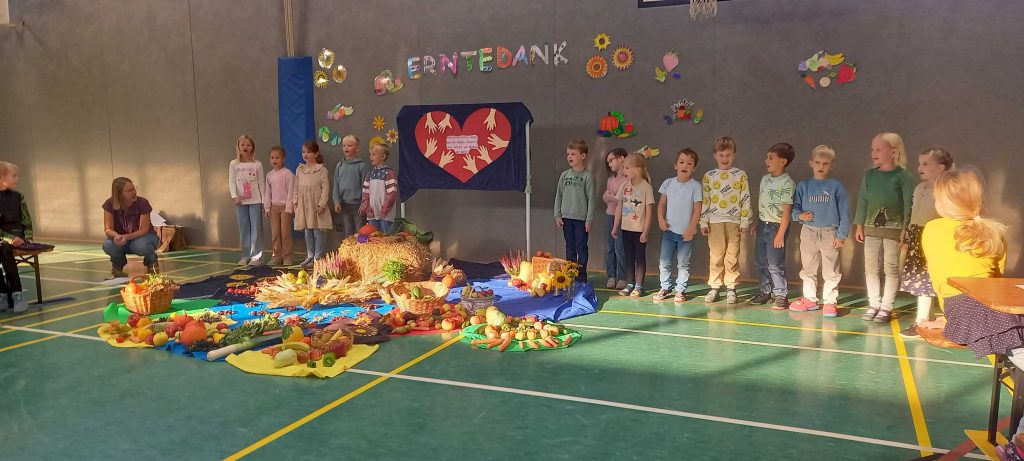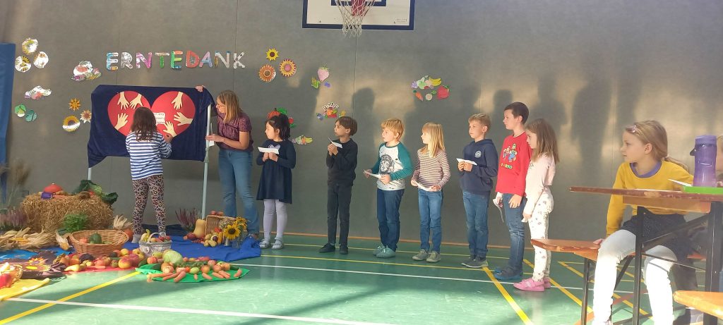 Im Anschluss hat Frau Siemund alle begrüßt, die gesamte Schule hat zusammen gesungen und von der Klasse 4a haben wir erfahren, worum es beim christlichen Erntedankfest eigentlich genau geht.