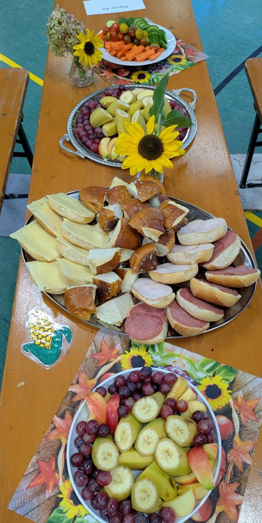 Ein unermüdliches Helferteam hatte schon früh morgens damit begonnen, ein reichhaltiges und gesundes Frühstücksbuffet mit verschiedenen leckeren Erntegaben vorzubereiten. Jeder Tisch bekam Brötchen, Obst und Gemüse.