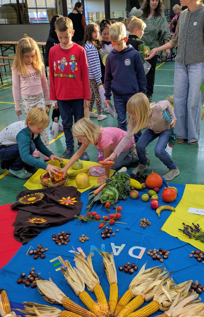 Im Rahmen dieses Festes haben wir unter anderem ein farbenfrohes Bodenbildung mit unseren Erntedankgaben gebaut.