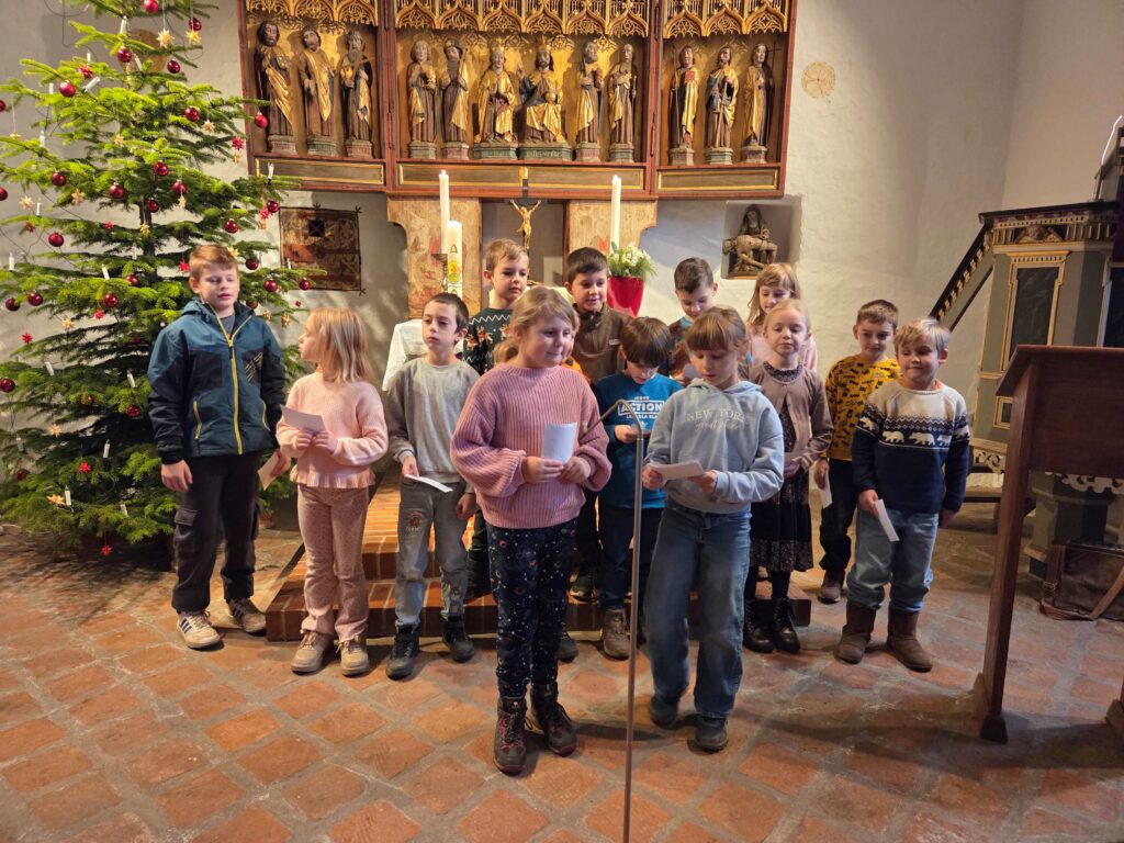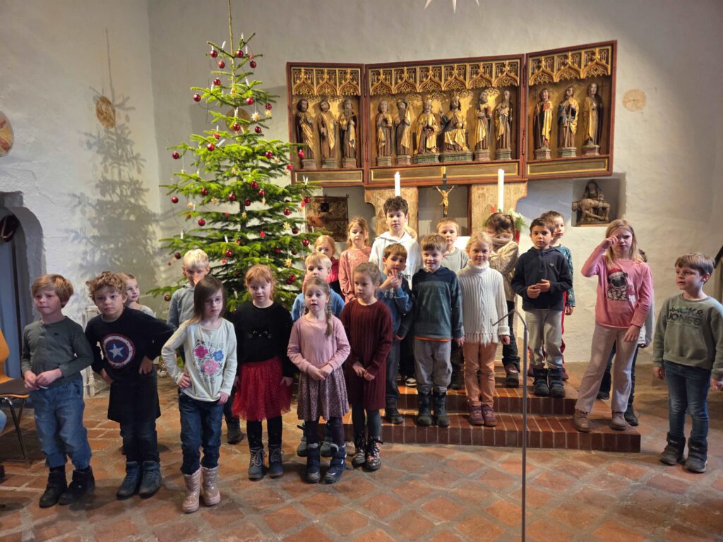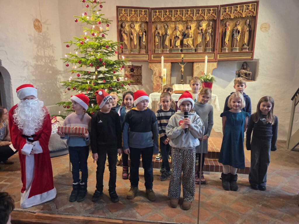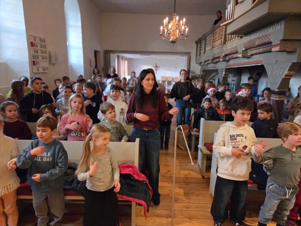 Am letzten Schultag vor den Weihnachtsferien machte sich die gesamte Schule gemeinsam mit allen Lehrerinnen auf den Weg zur Kirche. Schon beim Eintreten wurden alle von feierlichem Glockenläuten empfangen. In der Kirche begrüßten uns der Pastor und der Organist, die den Gottesdienst begleiteten.