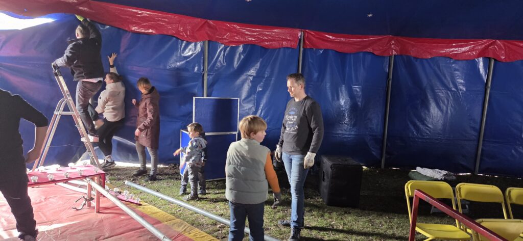 Nach der Show zeigten unsere Eltern und Lehrerinnen erneut vollen Einsatz und halfen am Abend beim zügigen Abbau des Zeltes.