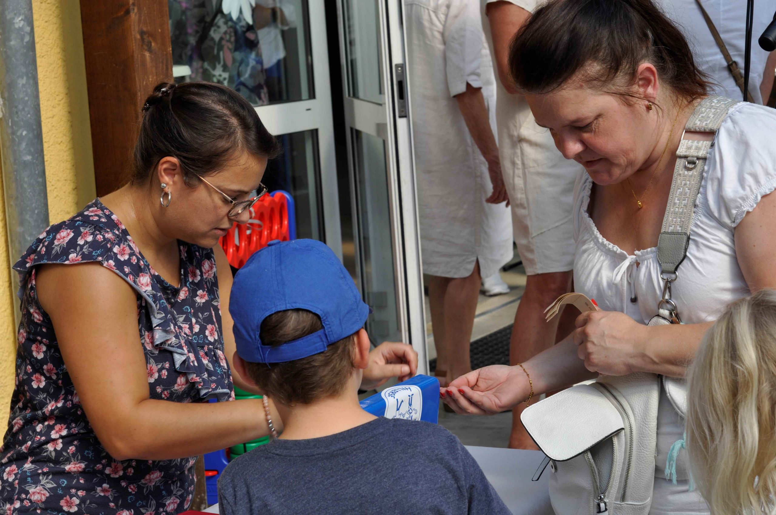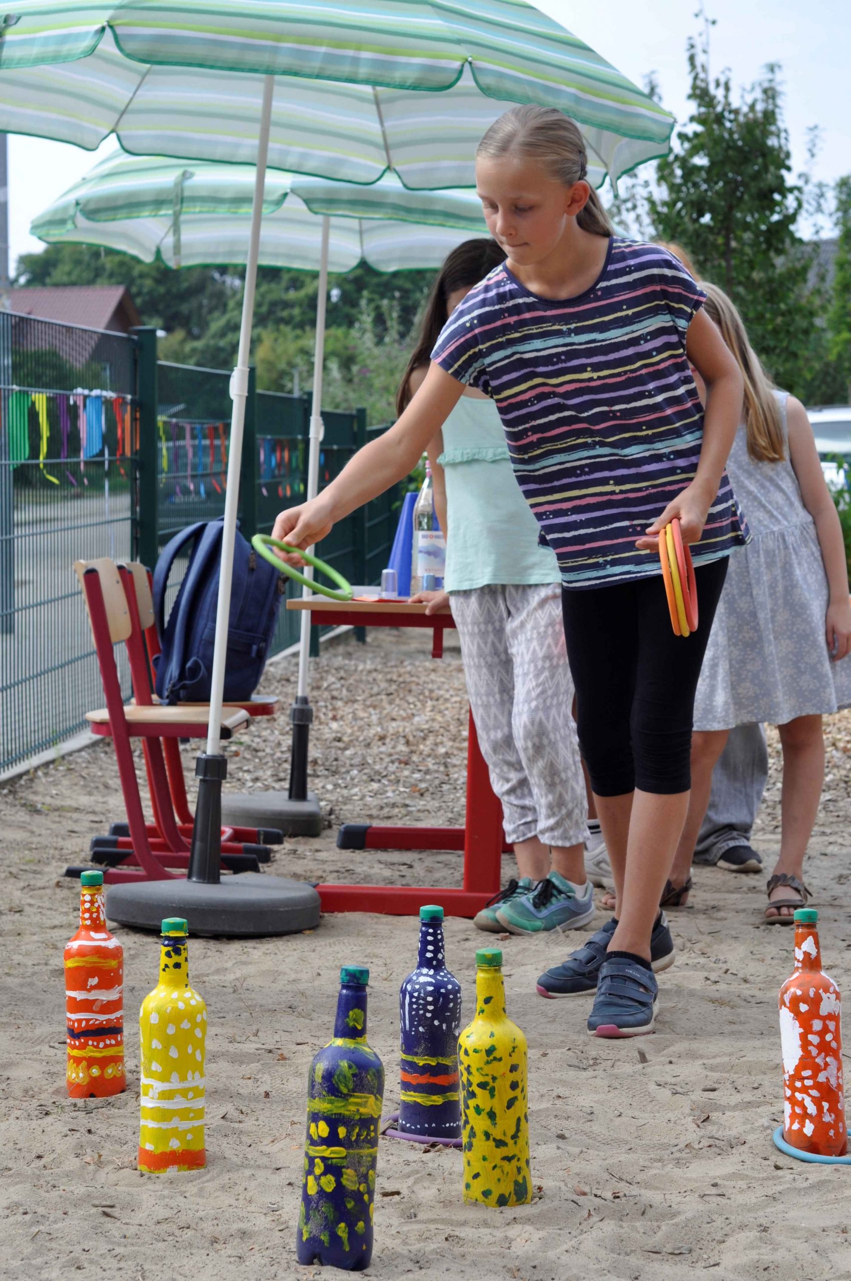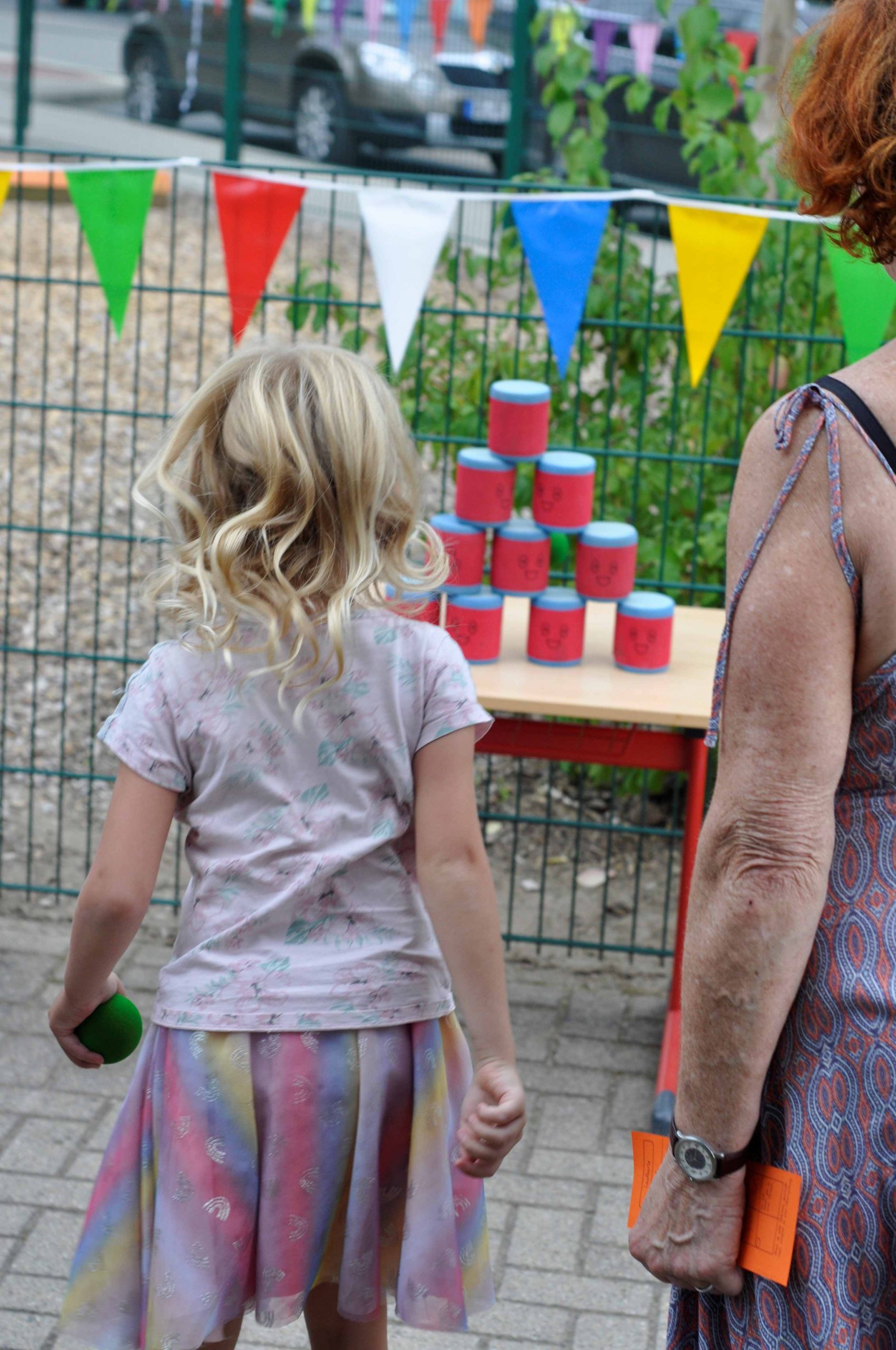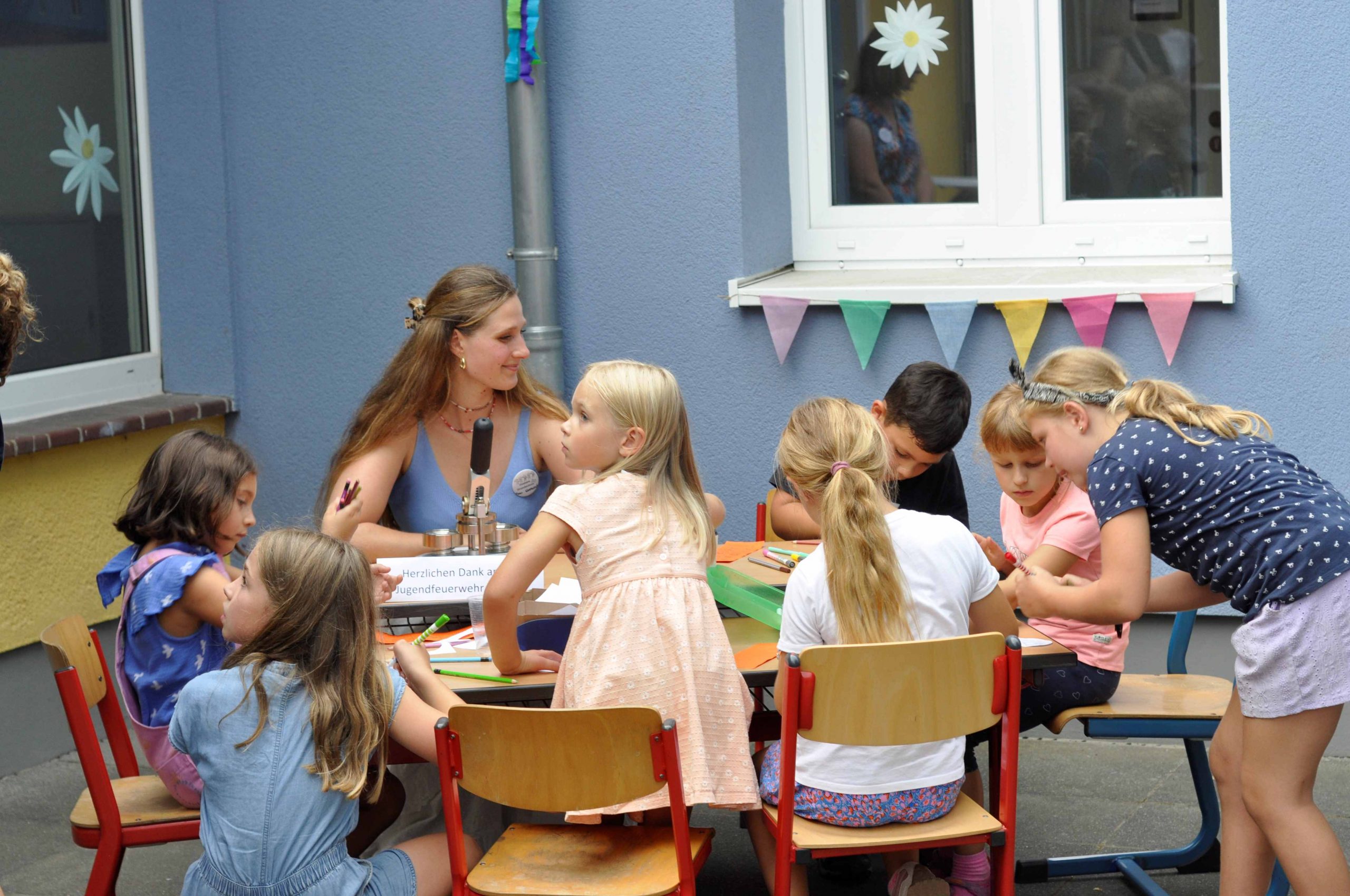 An einer Buttonstation konnten die Kinder sich Buttons zum Schulfest herstellen. Parallel gab es für alle Gäste die Möglichkeit in gemütlichen Runden an den vielen Tischen und Bänken des Fördervereins zu verweilten und sich an den erfrischenden Getränken, Waffeln und Würstchen zu erfreuen oder Gebasteltes der Kinder, selbstgemachtes Müsli und Gemüsepaste gegen Spende zugunsten des Fördervereins erwerben konnten.